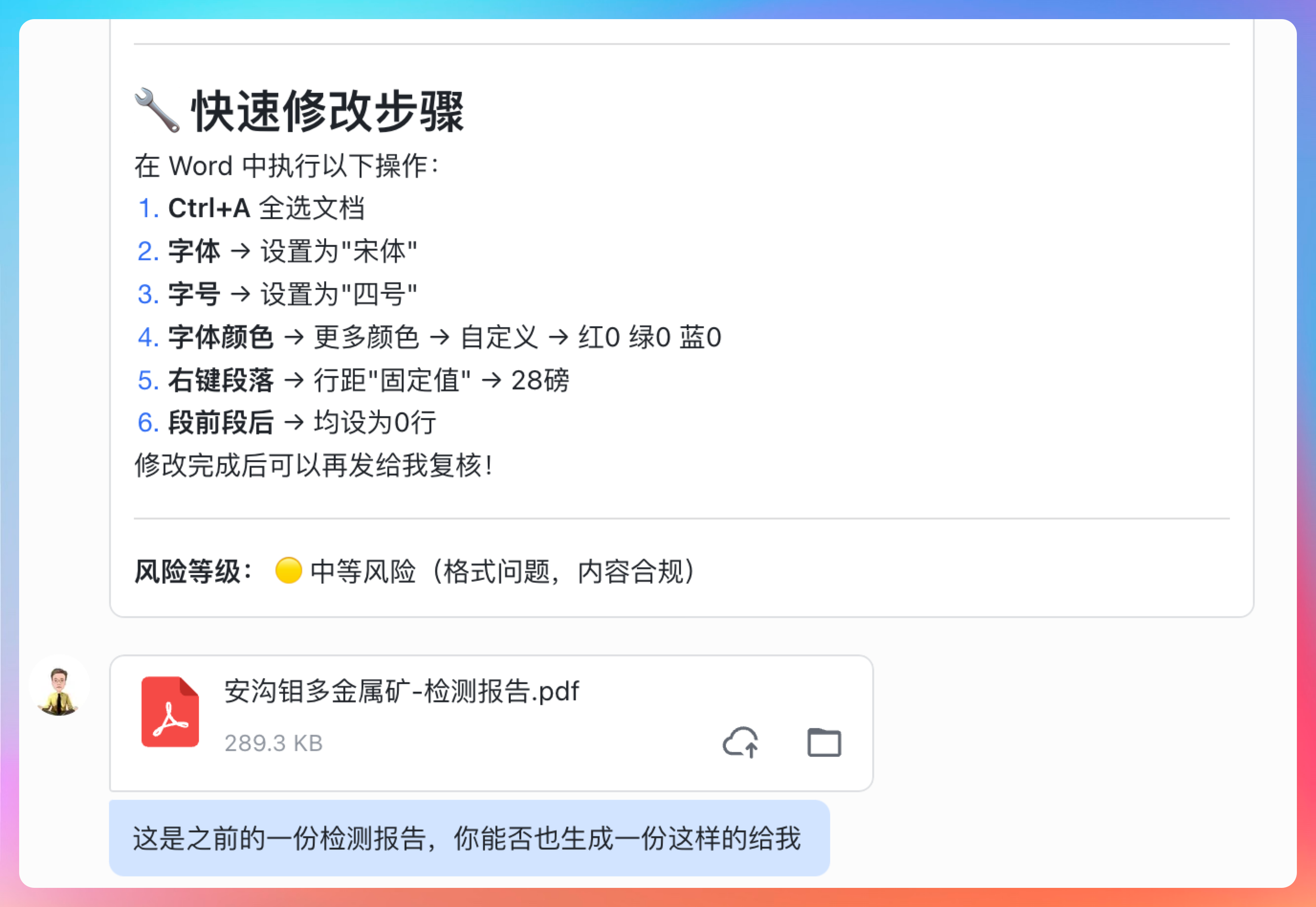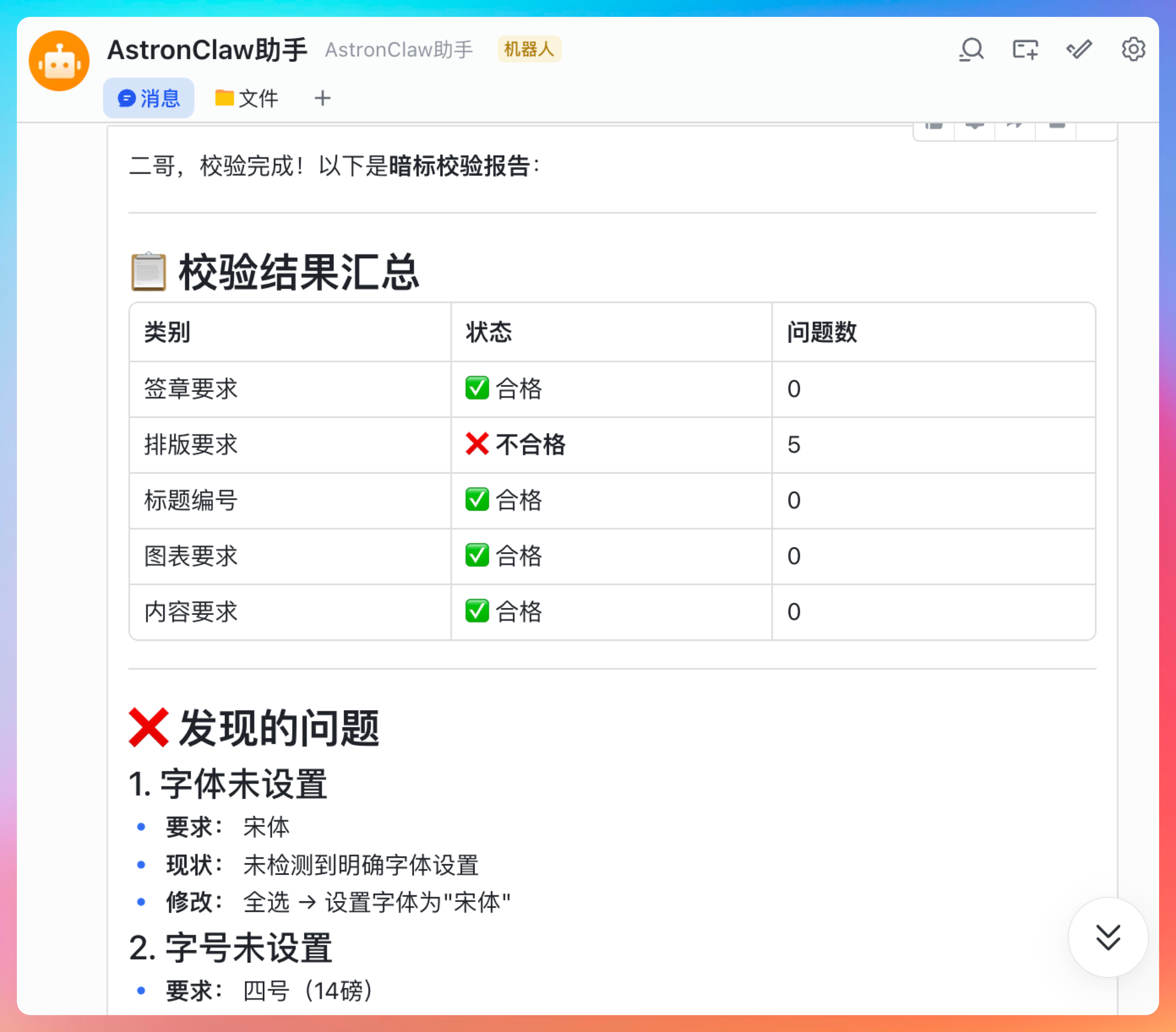 那我们继续,让 AstronClaw 按照之前的检测报告格式,也给我们生成一份,看看他的学习能力。
