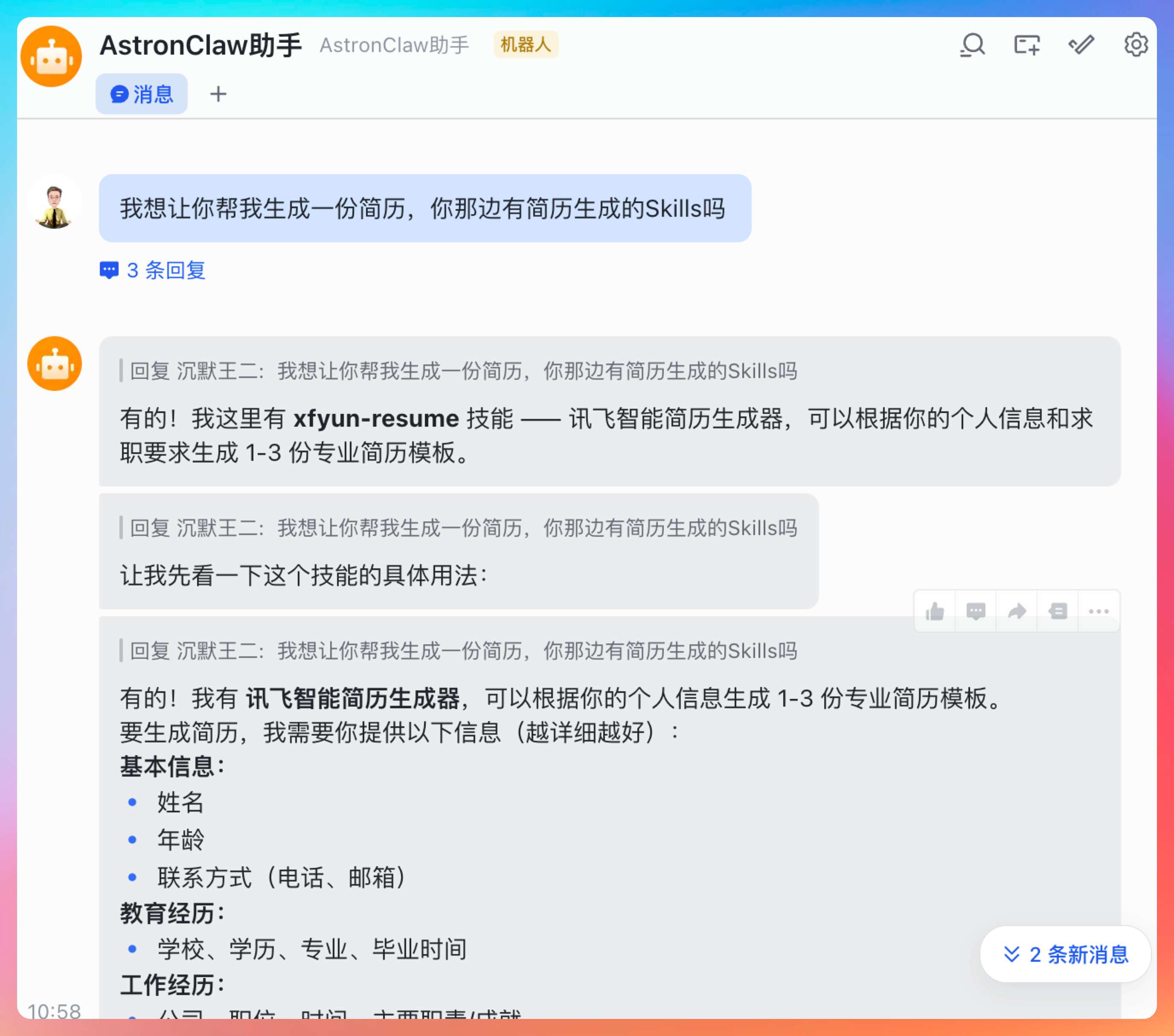 看到 AstronClaw 回复我们了,说有的,有一个 xfyun-resume 的 Skills 可以用。