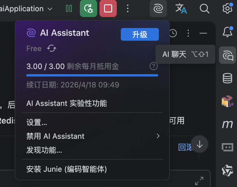 打开 IDE 右上角的 JetBrains AI 小部件,点击“开始使用”,如果之前没有安装 AI Assistant 插件,需要先安装。