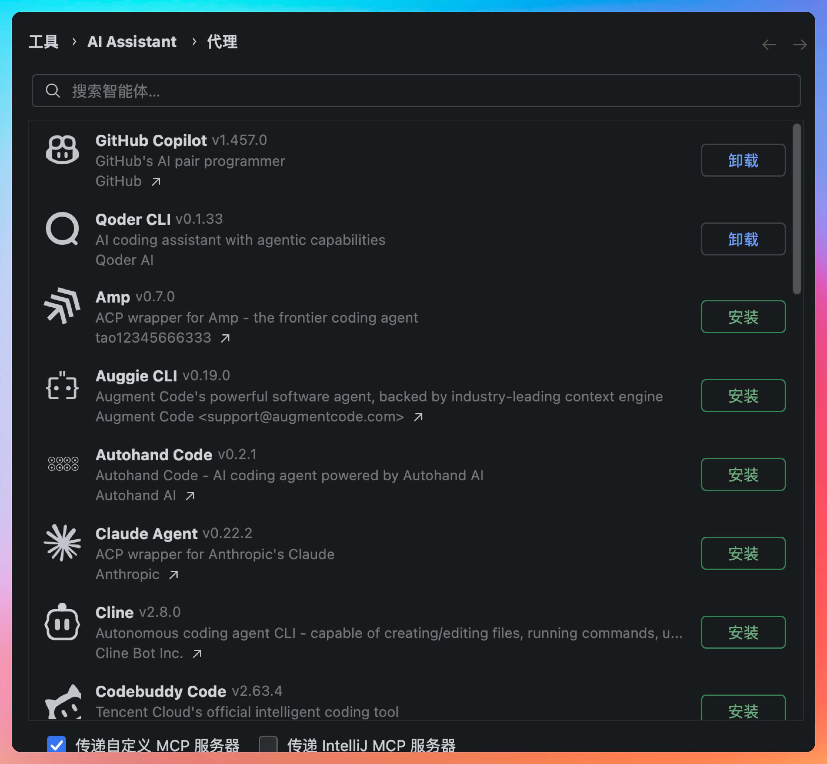 目前支持 ACP 协议的 IDE 有 JetBrains 全家桶(IntelliJ IDEA、PyCharm、WebStorm 等)和 Zed 编辑器。支持 ACP 协议的 Agent 有 Claude Code、Codex、Qoder 等。