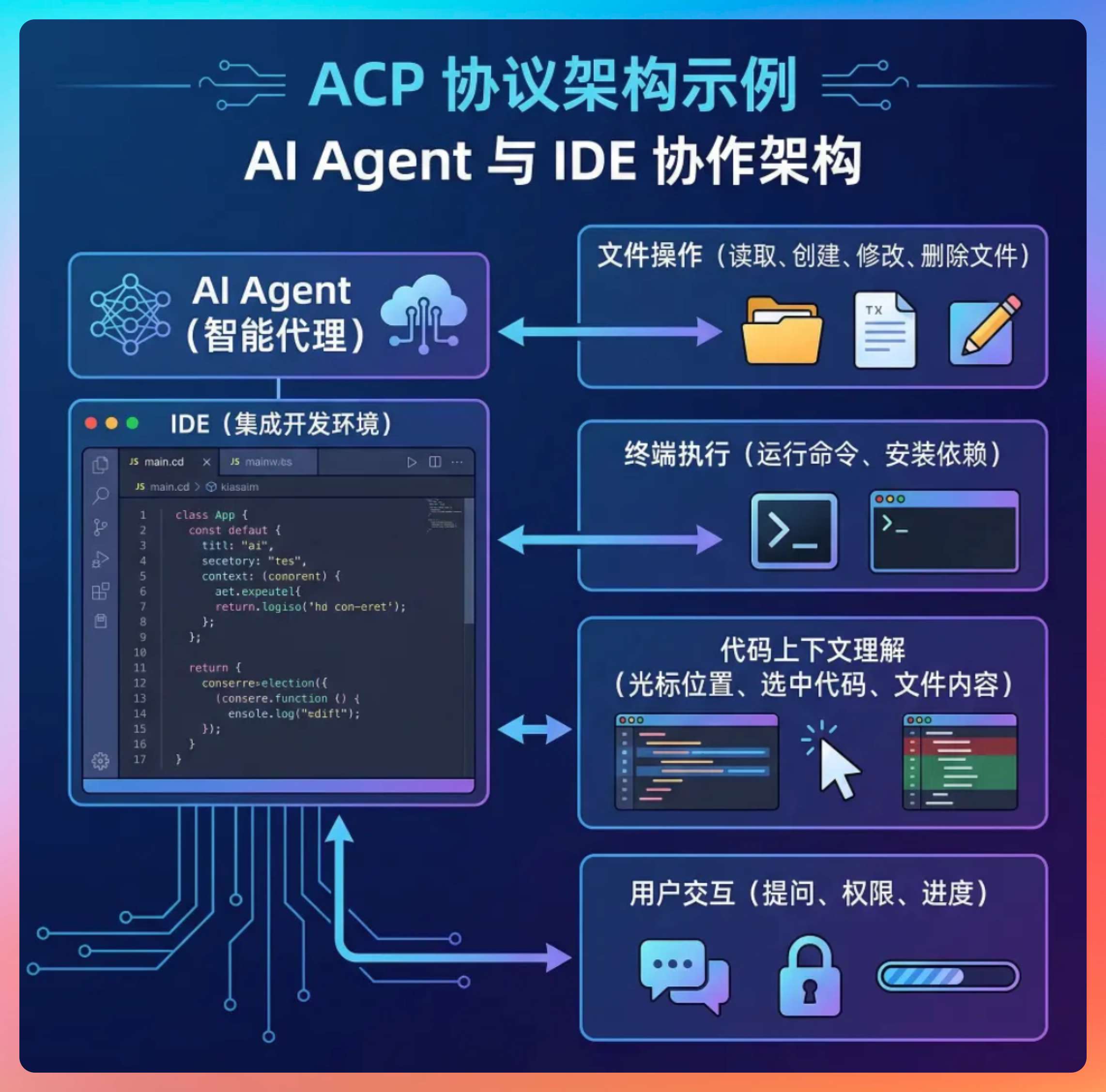 ACP 协议的设计非常精巧,它定义了一套标准化的通信接口,让 Agent 和 IDE 之间能够高效协作。