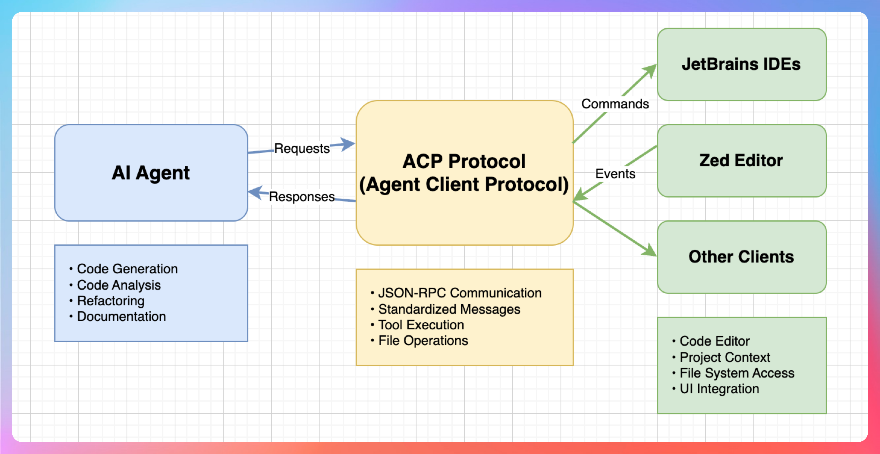 ACP 解决的是另一个层面的问题,它让不同的 AI Agent 都能接入到同一个 IDE 中。LSP 关注的是“编辑器如何理解代码”,ACP 关注的是“AI 如何帮你写代码”。