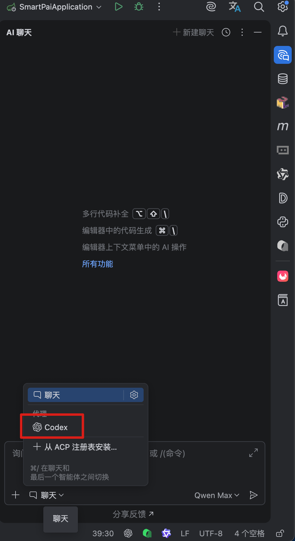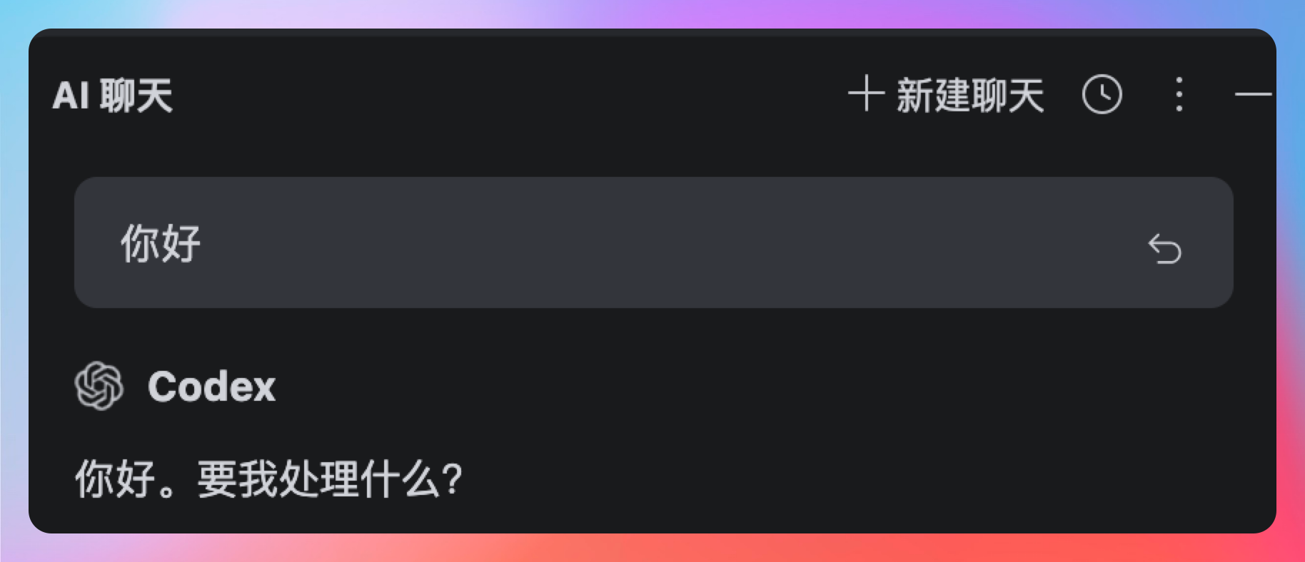 好,我们进入实操。点击 AI 聊天的小图标,开启首次对话。在左下角可以看到【聊天】的图标,点开他,不出意外,你能看到 Codex 的图标。