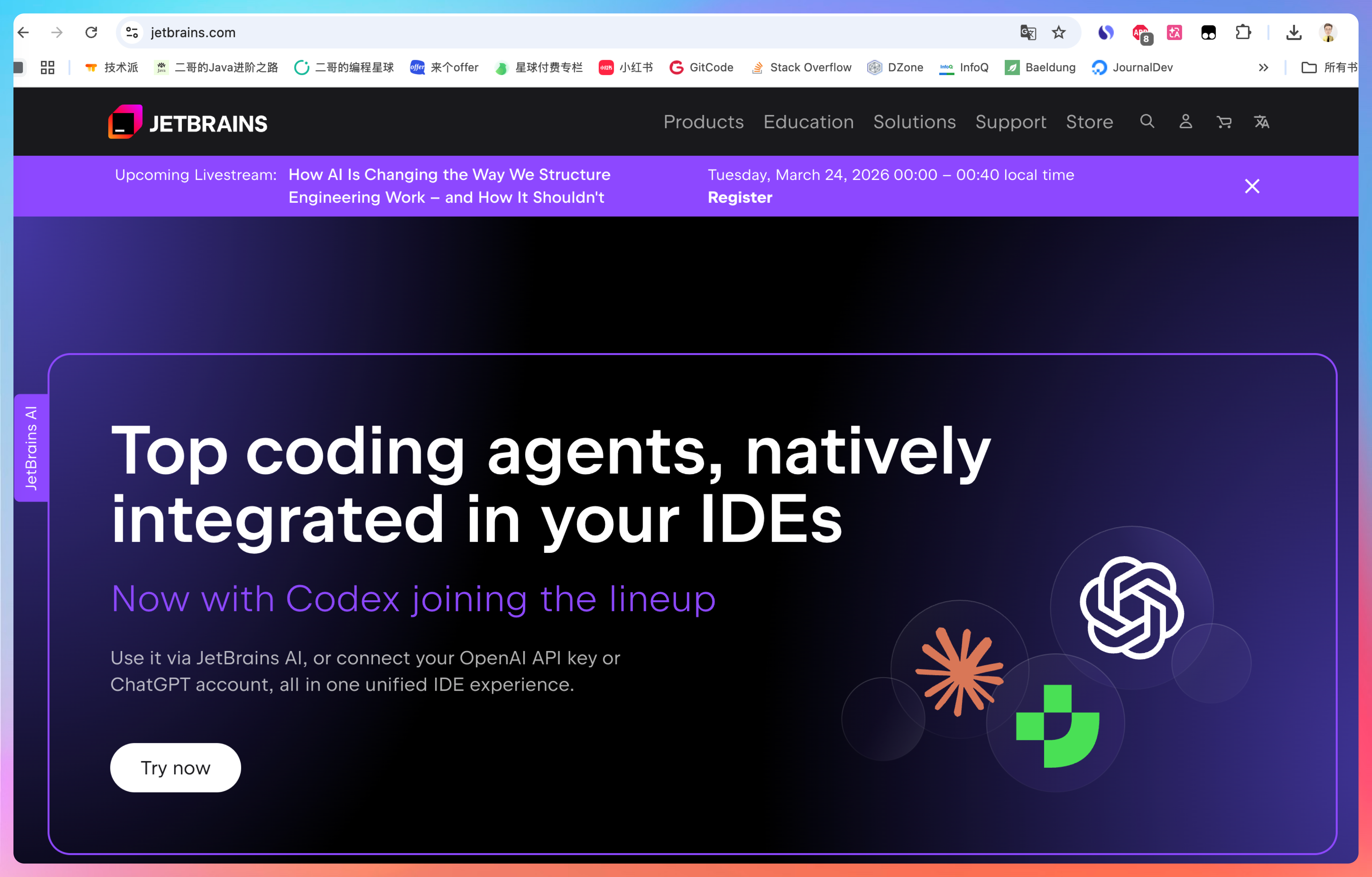 巨大的横幅就摆在官网首页,说明他们对 AI 能力很重视。要知道,JetBrains 可是出了名的稳重,能在官网首页放这么大一个横幅,说明他们对这次集成是下了决心的。