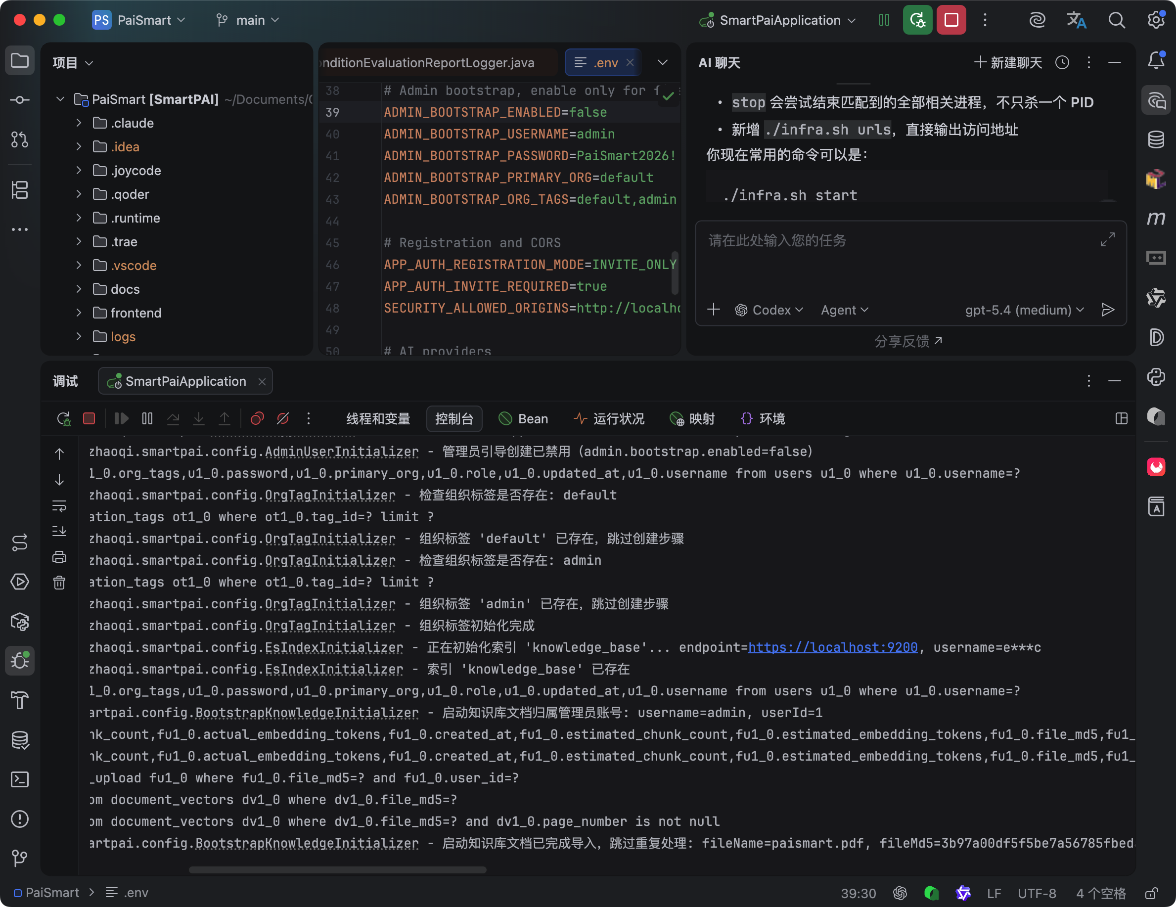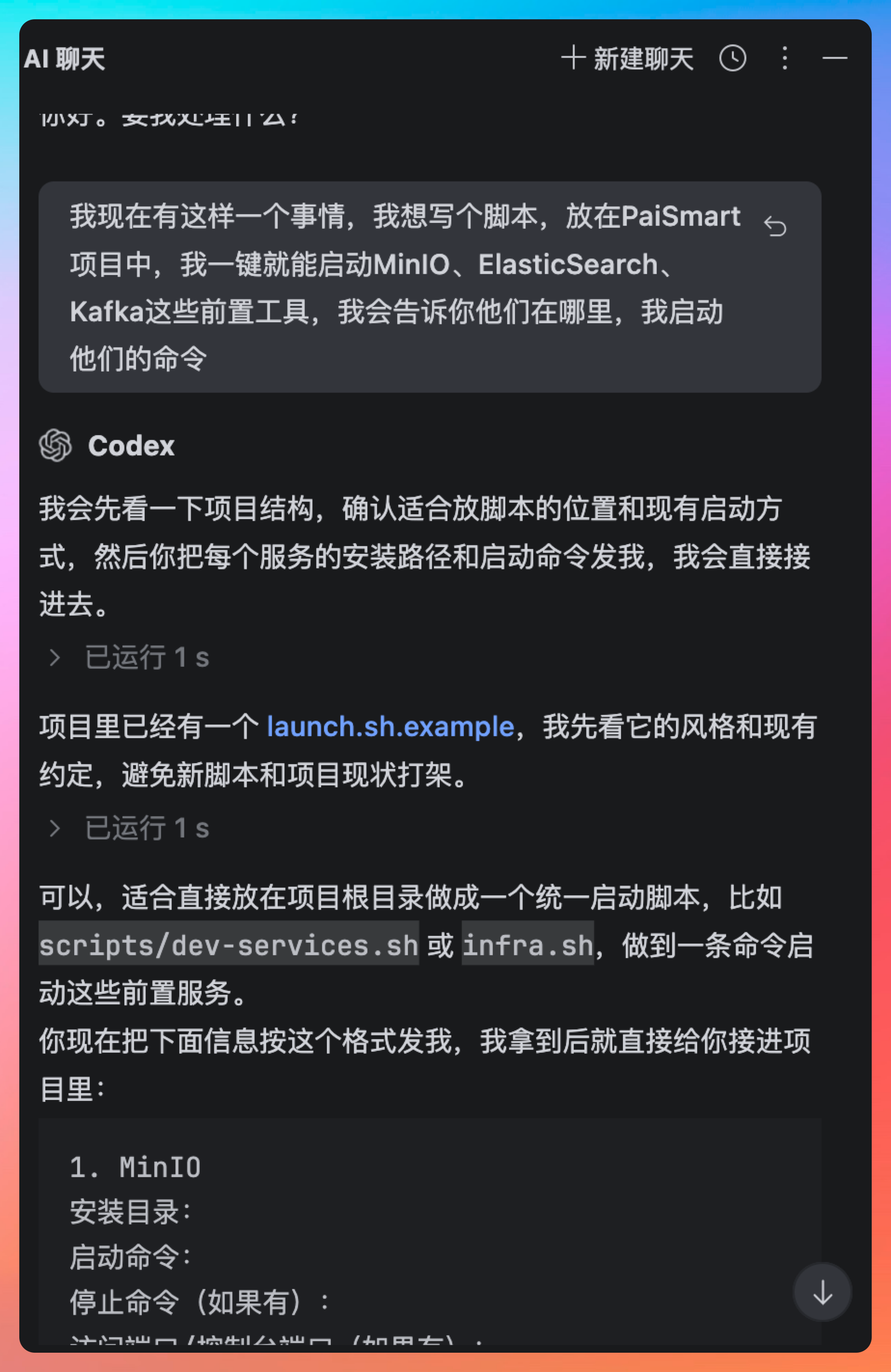 刚好我有一个派聪明 RAG 的项目,启动前需要先启动 ElasticSearch、Kafka 和 MinIO,之前我都是在终端一个一个启动的,现在我就想让 Codex 帮我写个脚本,一键启动这三个服务。