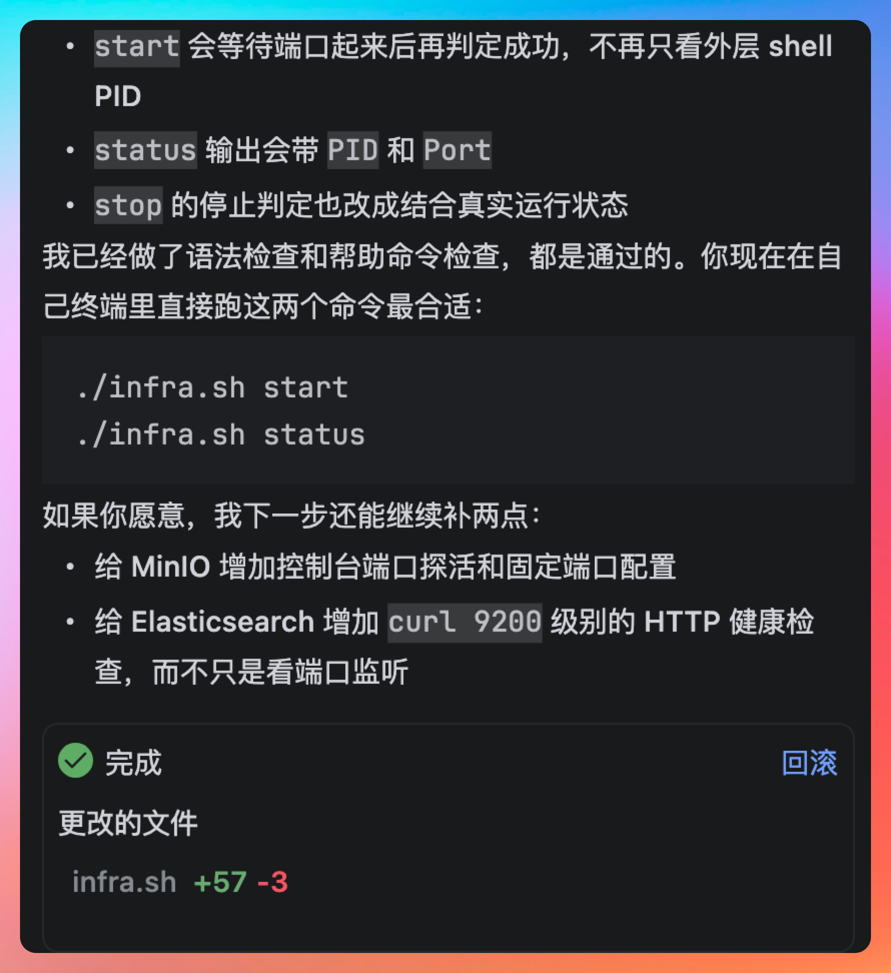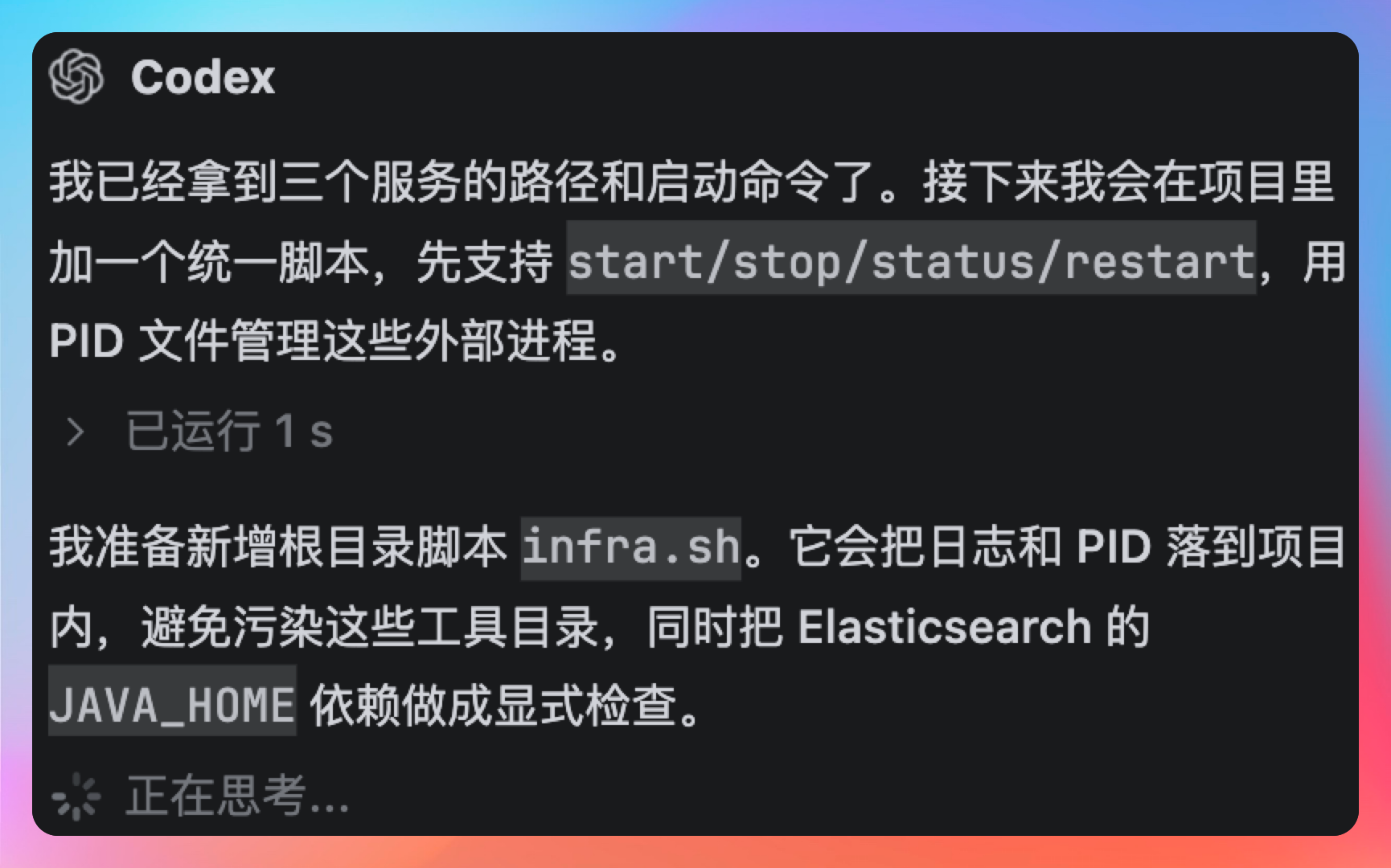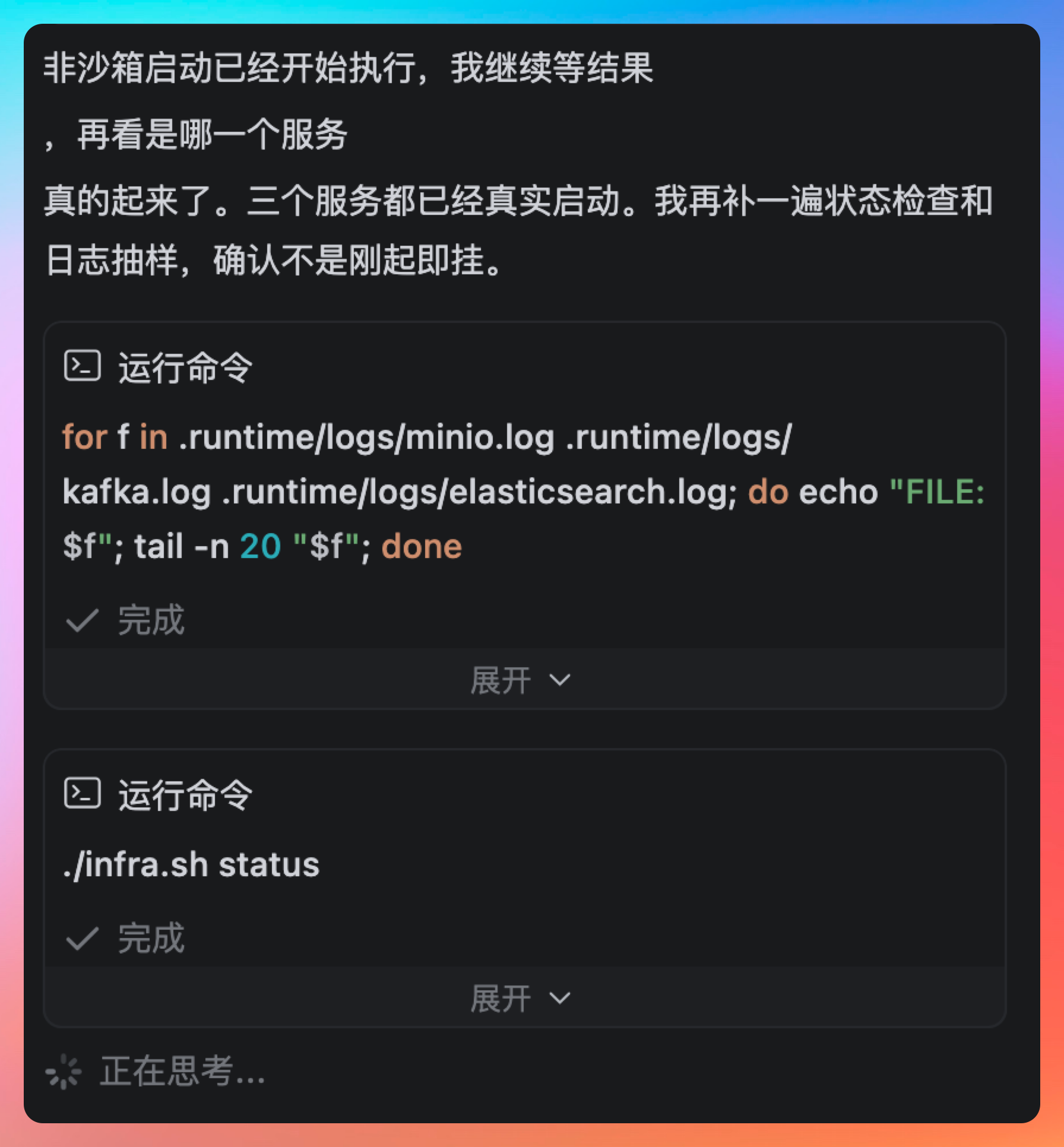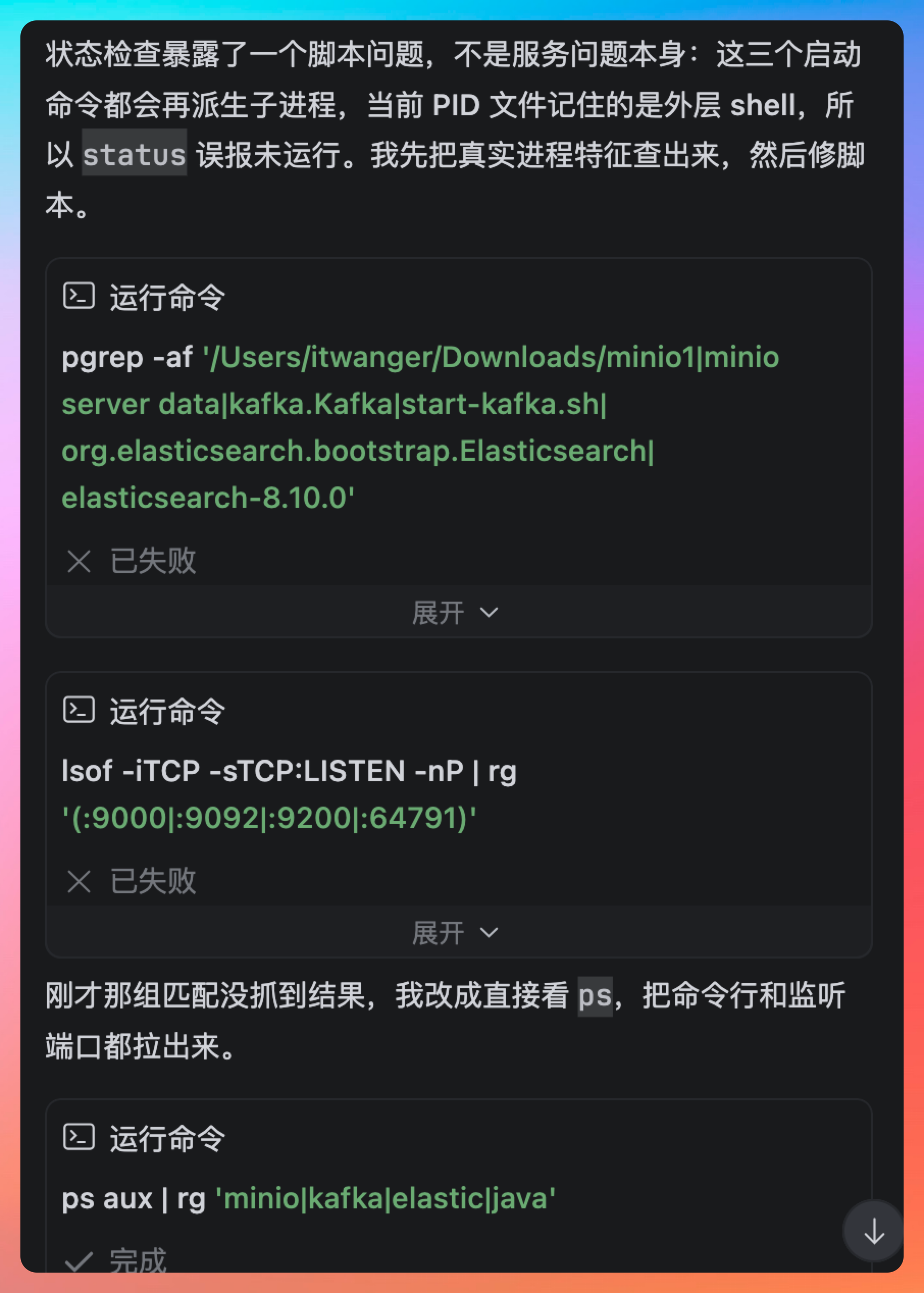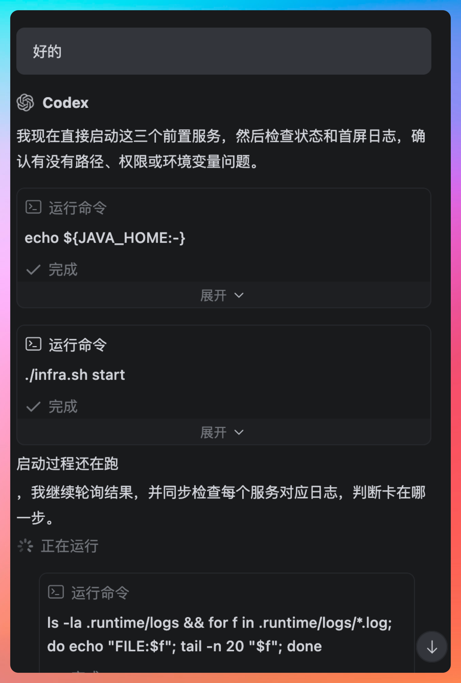 这下三个服务都启动起来,Codex 还会确认到底有没有启动起来,去主动检查日志,避免刚启动起来就挂掉。