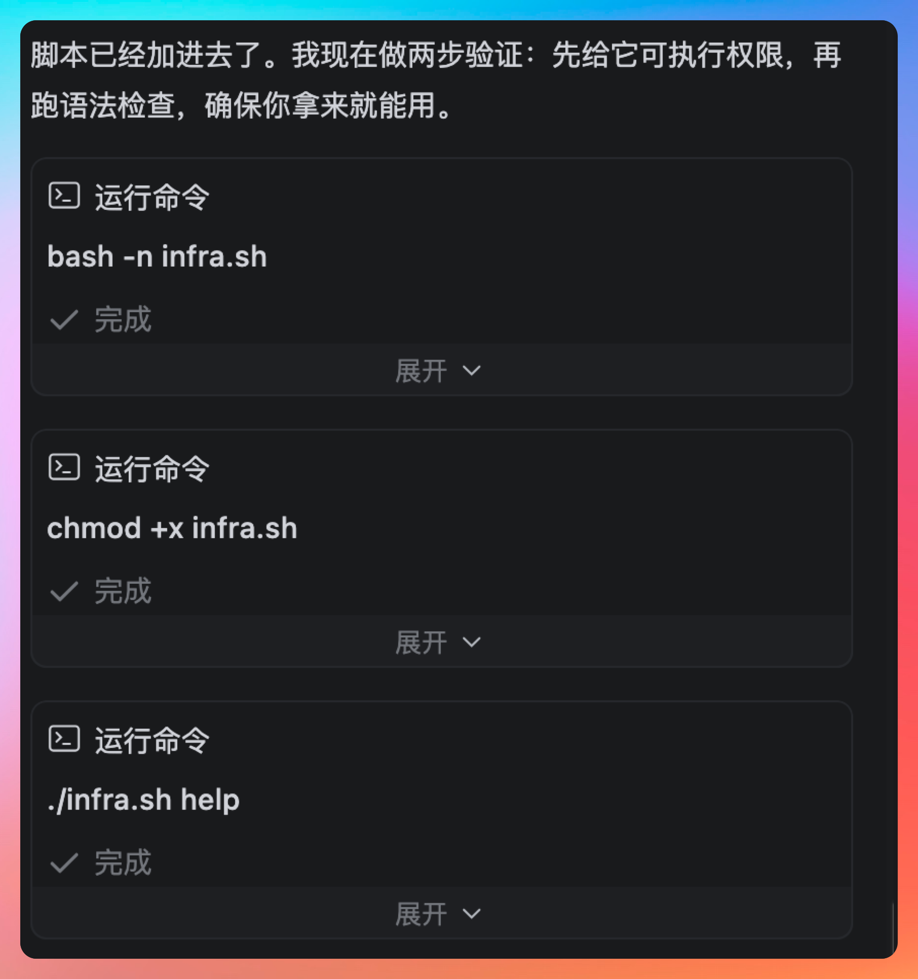 好,Codex 准备帮我们创建 infra.sh 脚本了。