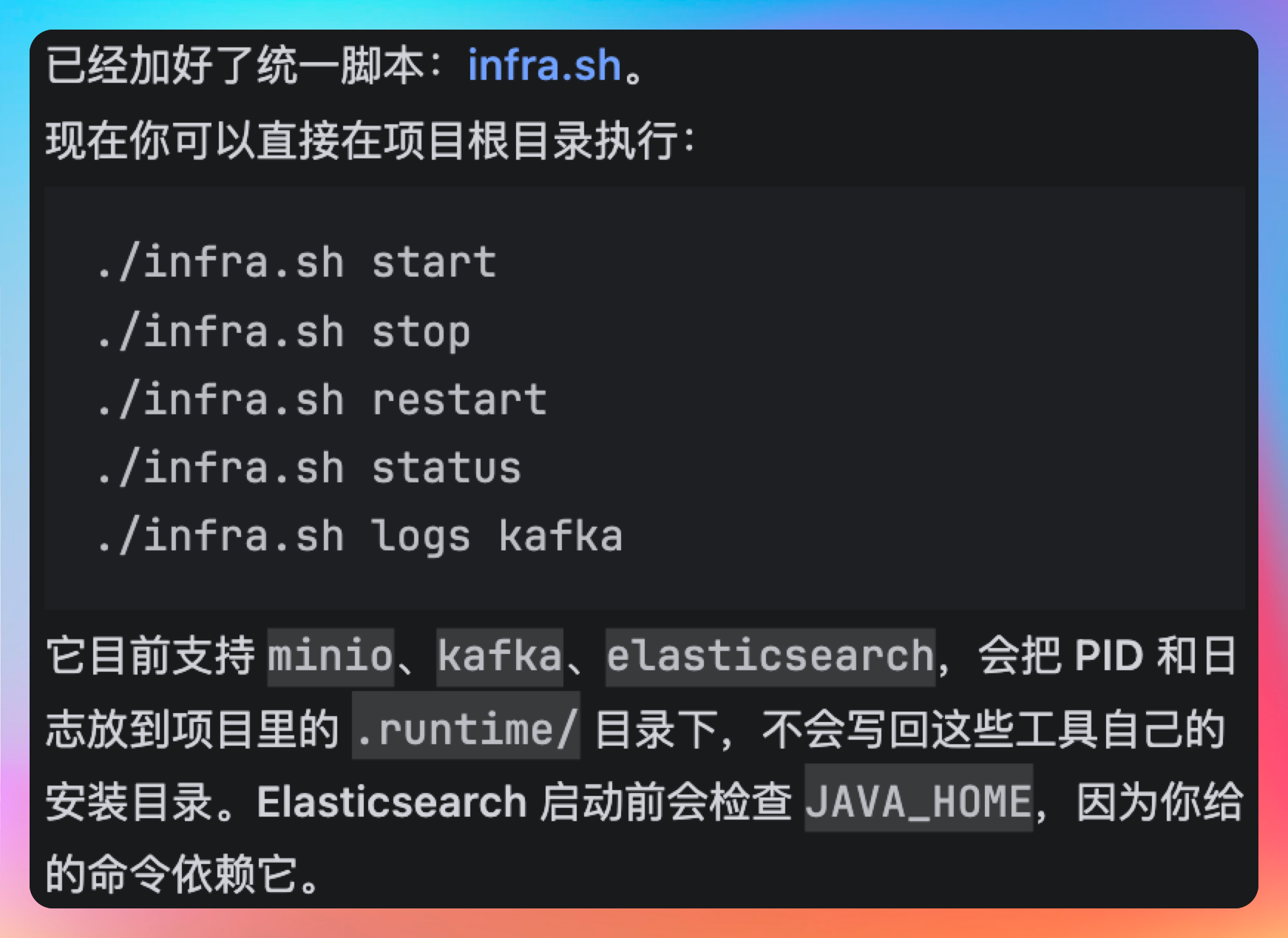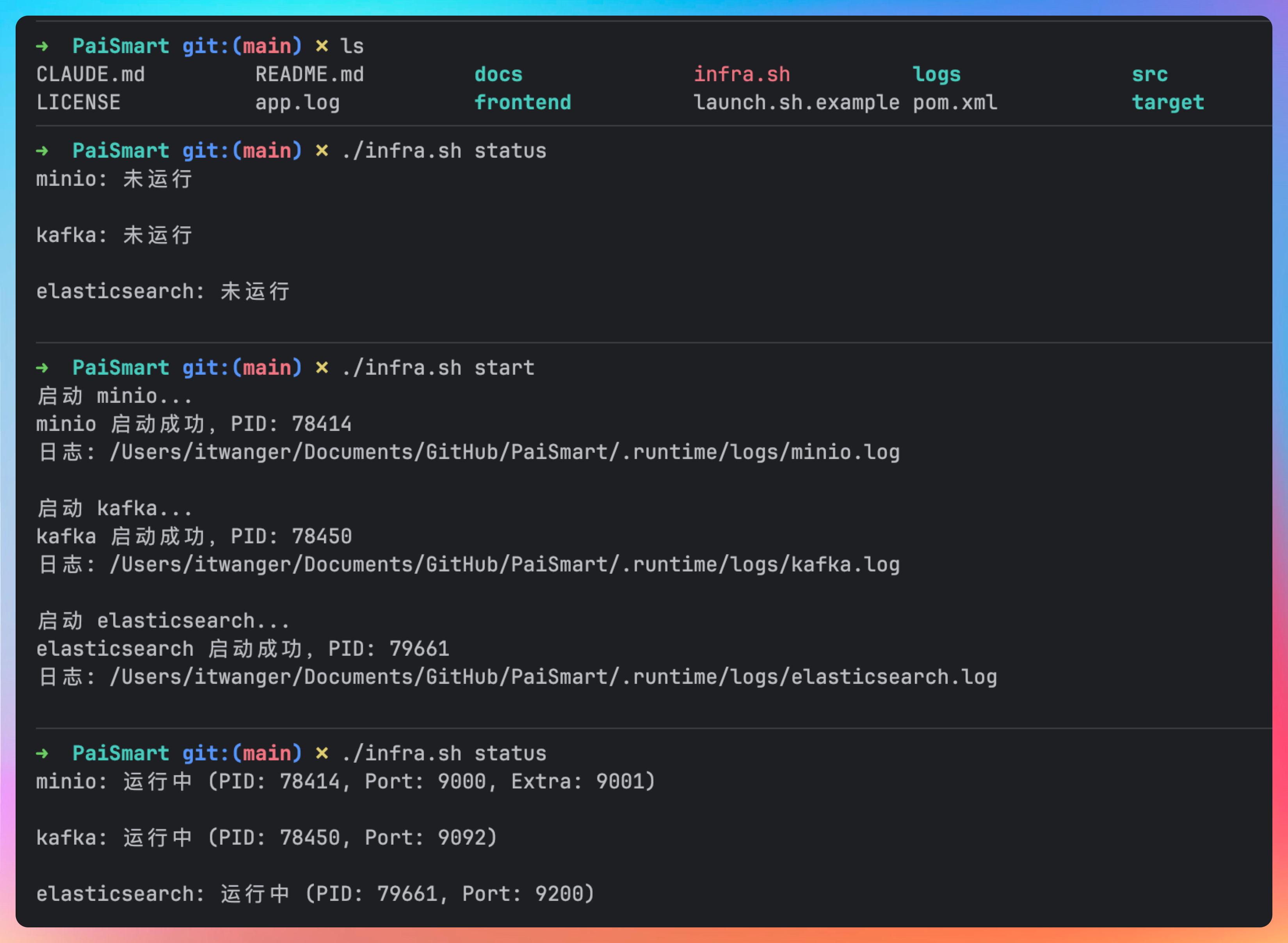 提示词:我现在有这样一个事情,我想写个脚本,放在 PaiSmart 项目中,一键就能启动 MinIO、ElasticSearch、Kafka 这些前置工具,我会告诉你他们在哪里,我启动他们的命令。