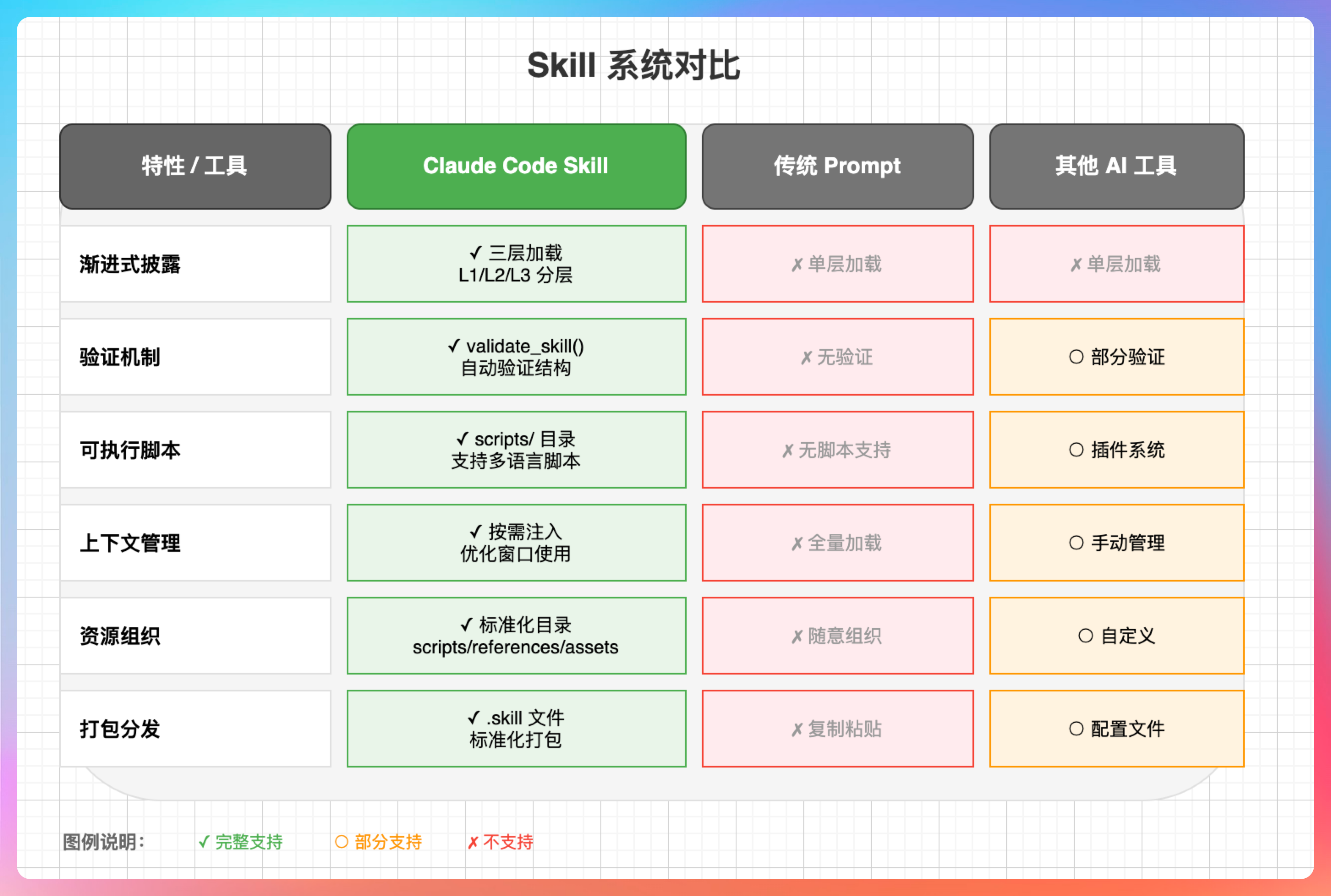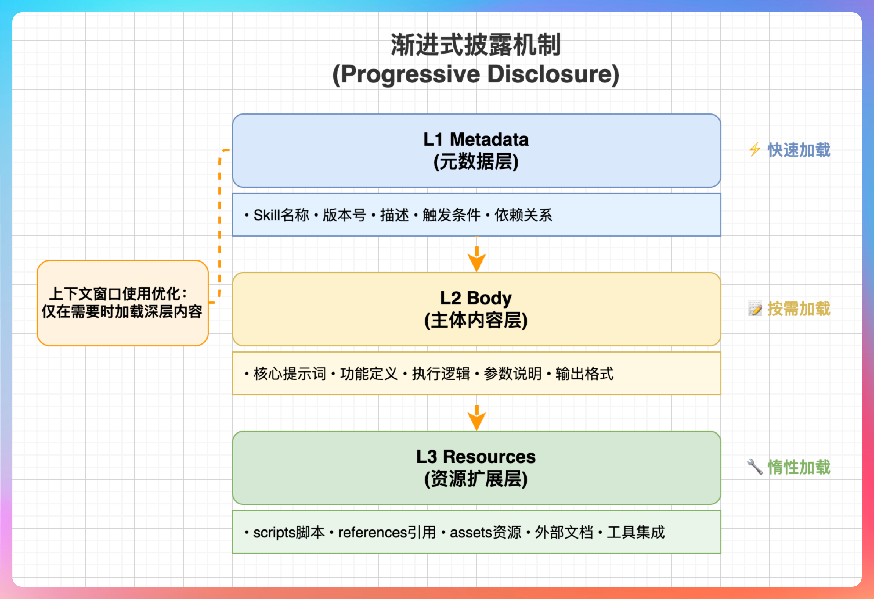 因为上下文窗口是有限的。如果所有 Skill 的完整内容都一直放在上下文里,那很快就爆掉了。通过渐进式披露,系统只加载当前需要的内容,既保证了功能完整,又不会浪费上下文空间。