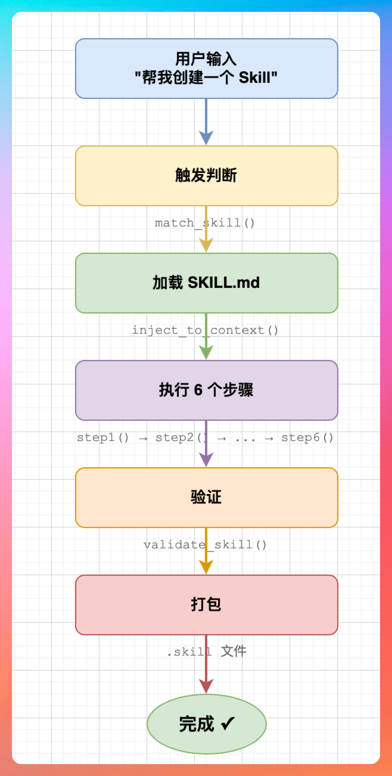 create-skill 涉及 3 个 Python 脚本、6 个主要步骤、数十个函数调用,但用户体验是流畅的、引导式的。你不需要知道背后发生了什么,只需要按照提示一步步走,就能创建出一个合格的 Skill。