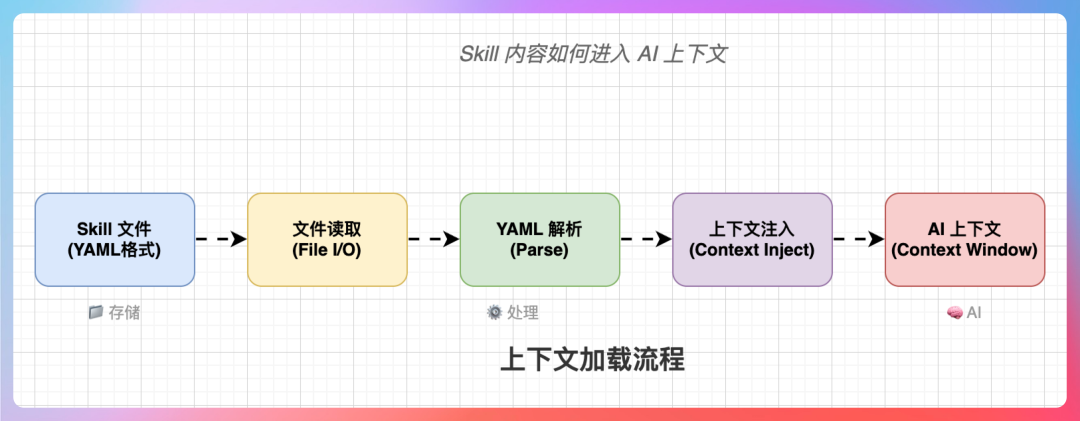 第三步,执行阶段。匹配成功后,才会加载这个 Skill 的完整内容。这时候 AI 才真正“看到”详细的指令和约束。