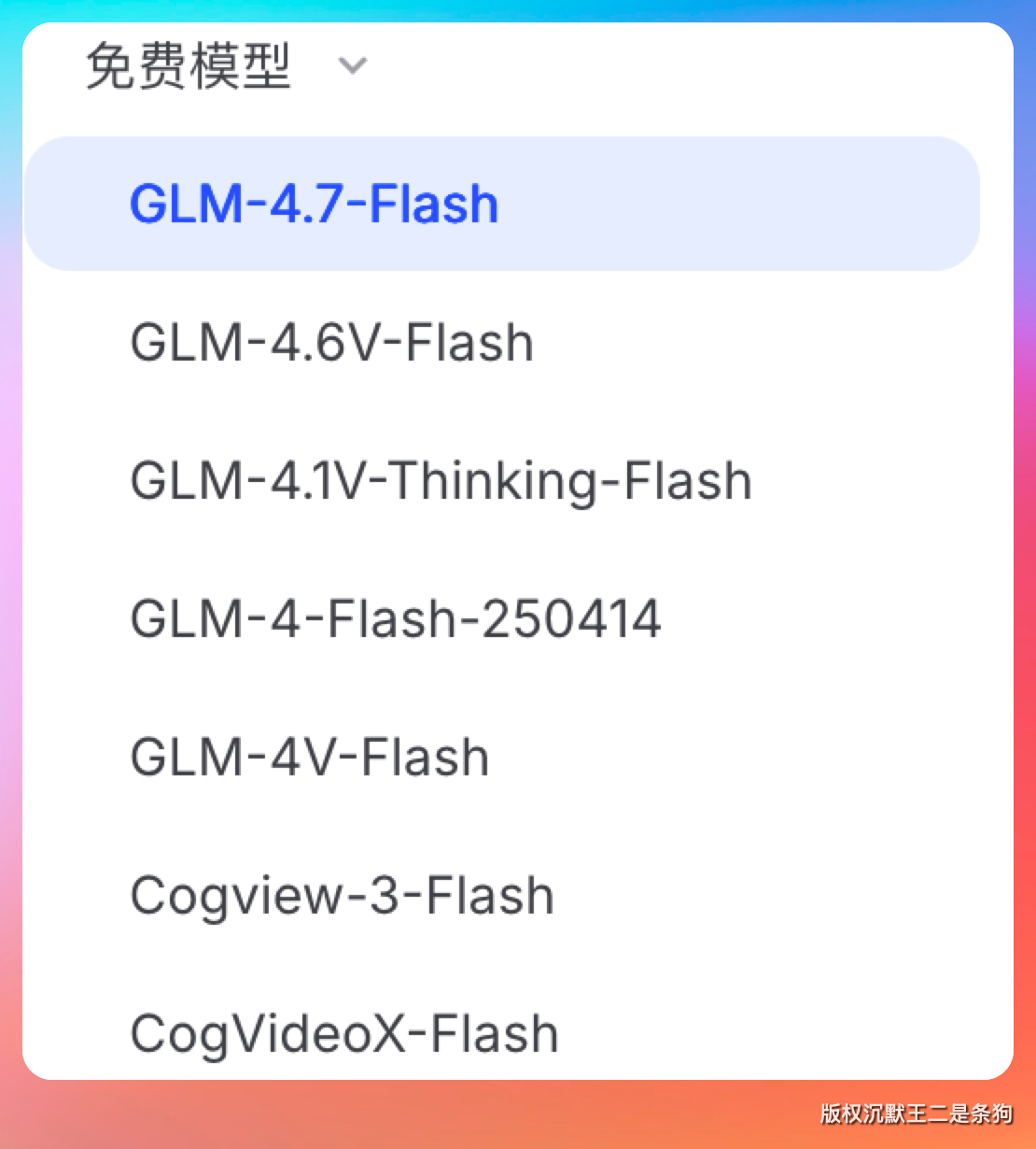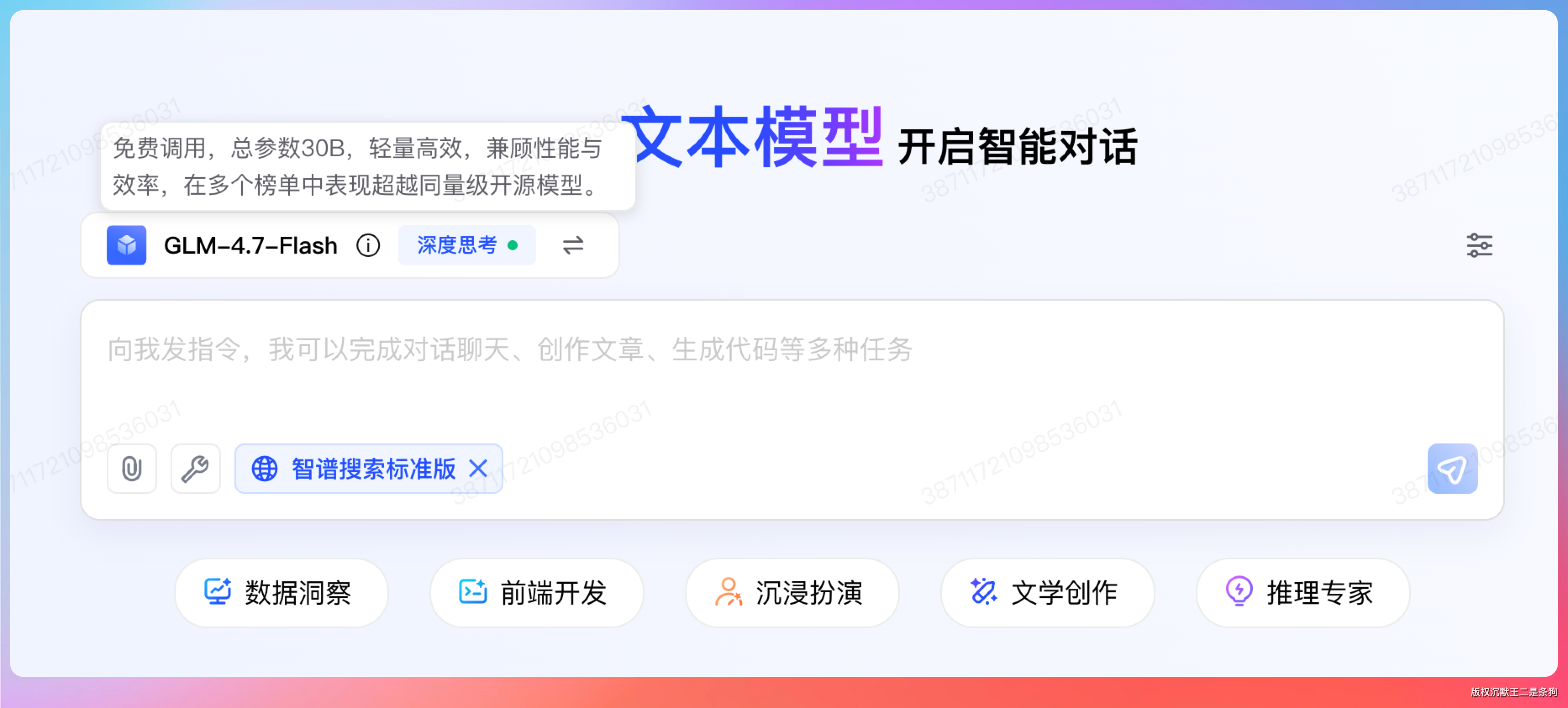 智谱 AI 的 GLM-4.7-Flash 也是永久免费不限量。GLM 家族作为国产大模型的头部选手,Flash 版本虽然不如旗舰版强,但日常对话、文本处理、代码辅助完全够用。