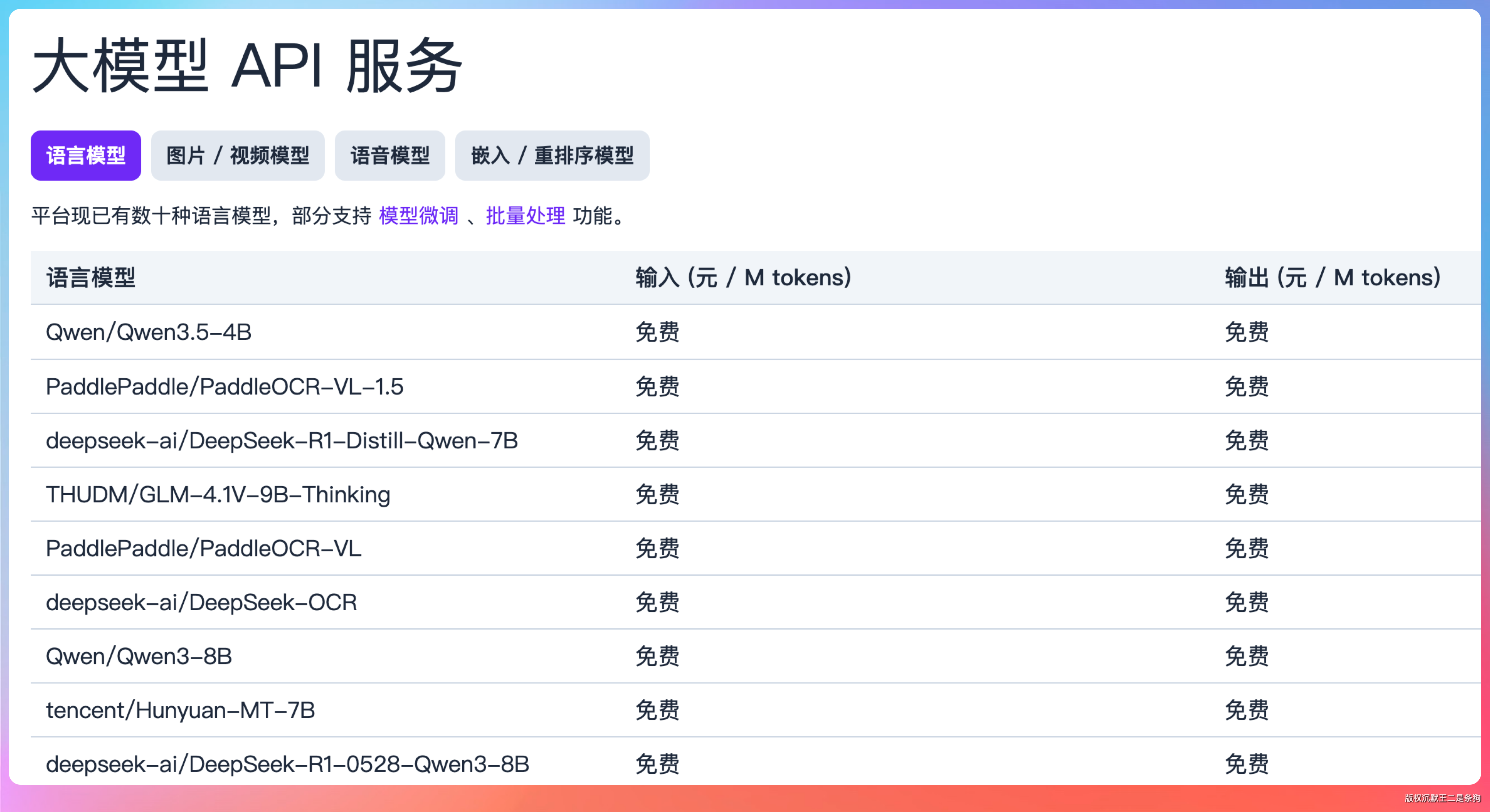 硅基流动注册就送大额 Token,邀请好友还有额外奖励。更关键的是,它聚合了 100 多个开源模型,Qwen、DeepSeek、Llama 全都有。小模型(比如 Qwen/Qwen3.5-4B)直接永久免费调用。