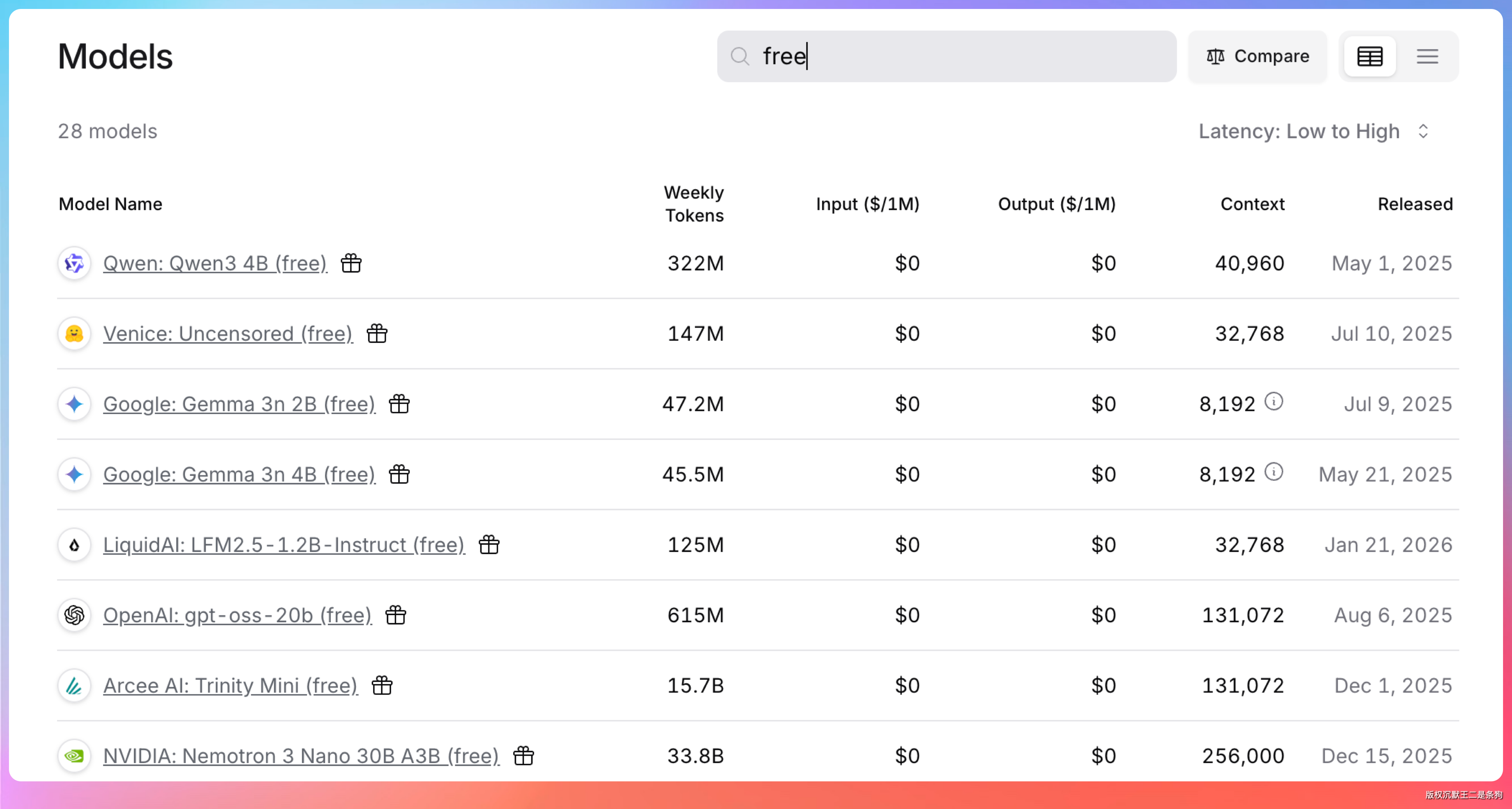 OpenRouter 是个聚合平台,目前有不少免费模型可用。好处是一个 API Key 调所有模型,做模型对比测试很方便。免费模型列表里包括 Llama、Qwen 等。