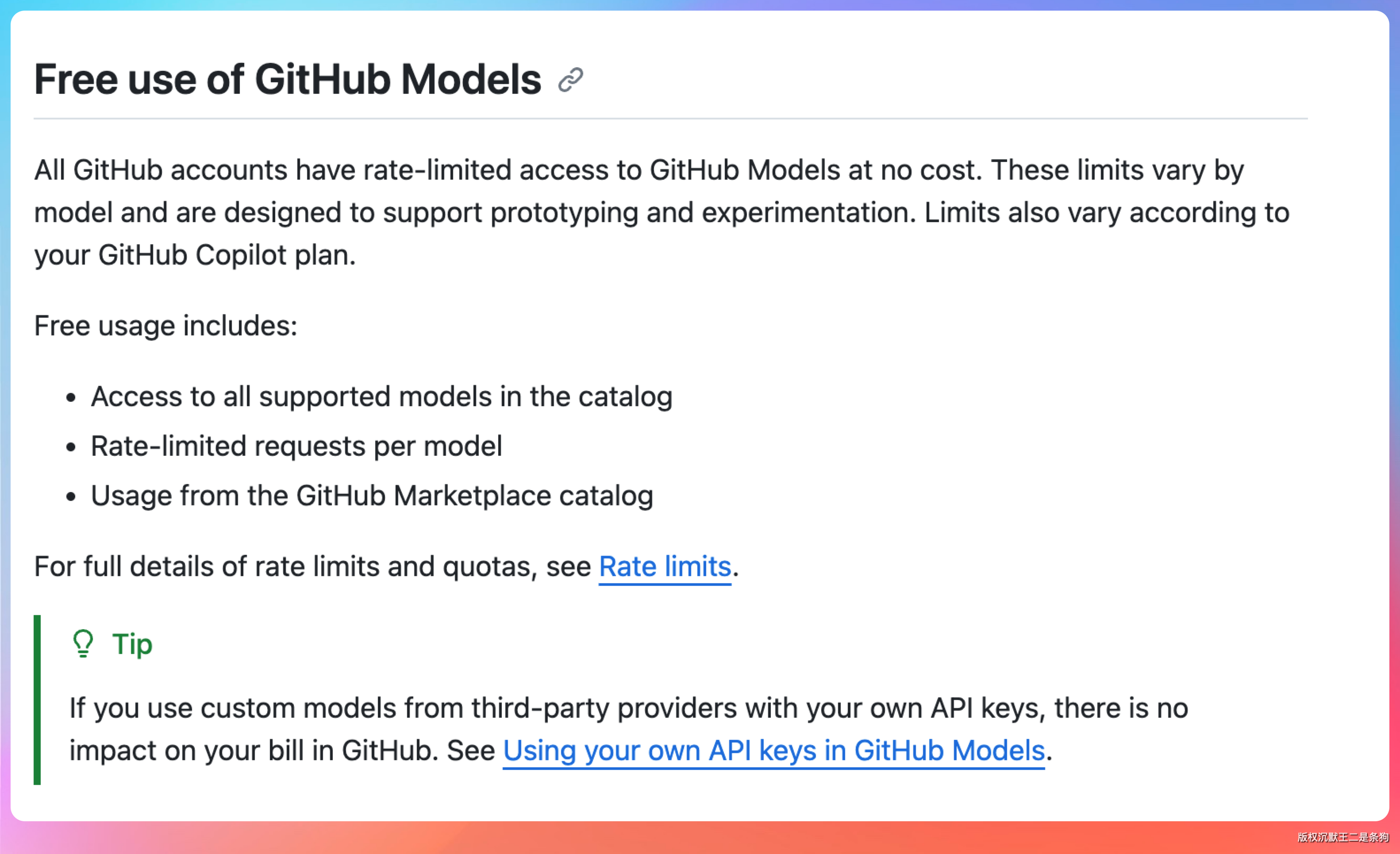 GitHub Models 对所有 GitHub 用户开放,如果你本来就是 GitHub 用户,这等于白捡的。对于想体验 OpenAI 模型但又不想绑海外信用卡的开发者来说,GitHub Models 目前是最便捷的入口。