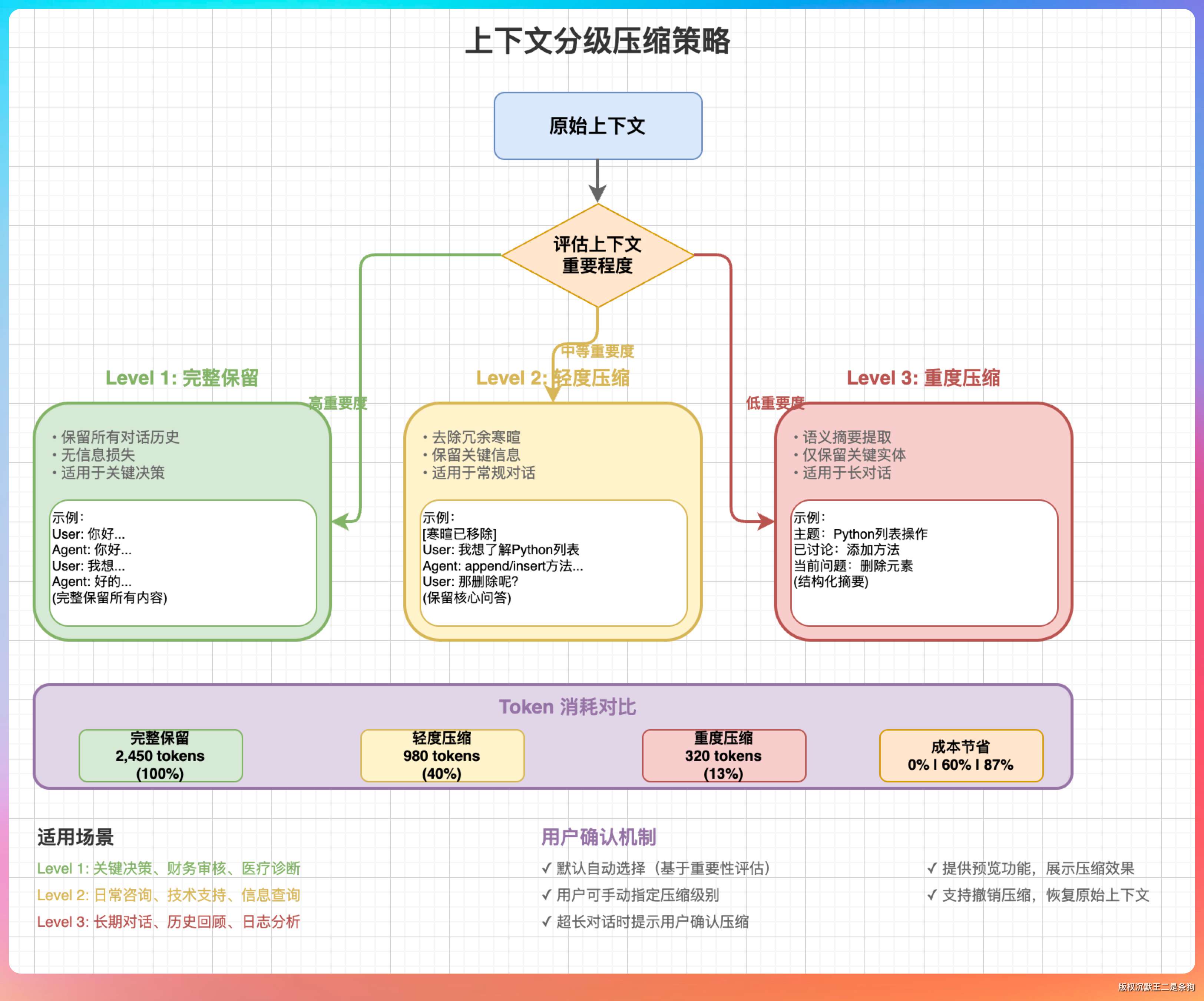 “有可能,所以压缩策略要设计得很小心。”我说,“一种做法是分级压缩。最近的几轮对话保持完整,稍早的对话做轻度压缩(保留关键信息),更早的对话做重度压缩(只保留结论)。”