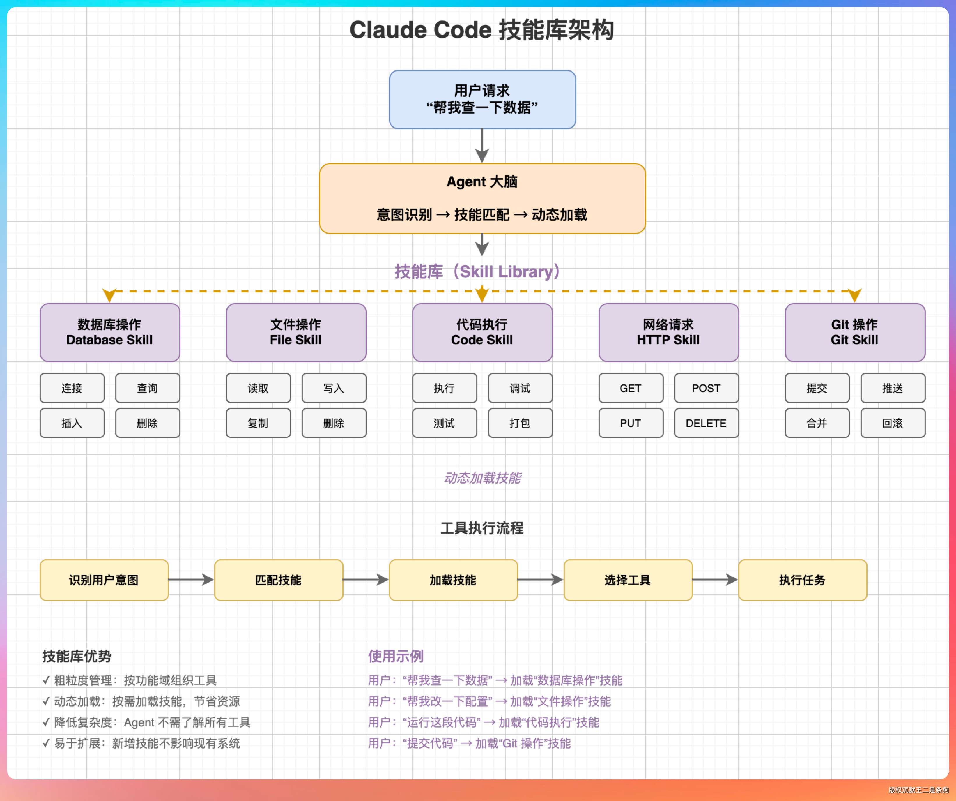 “用户说‘帮我查一下数据’,Agent 加载‘数据库操作’技能;用户说‘帮我改一下配置’,Agent 加载‘文件操作’技能。这样粒度更粗,管理起来更方便。”