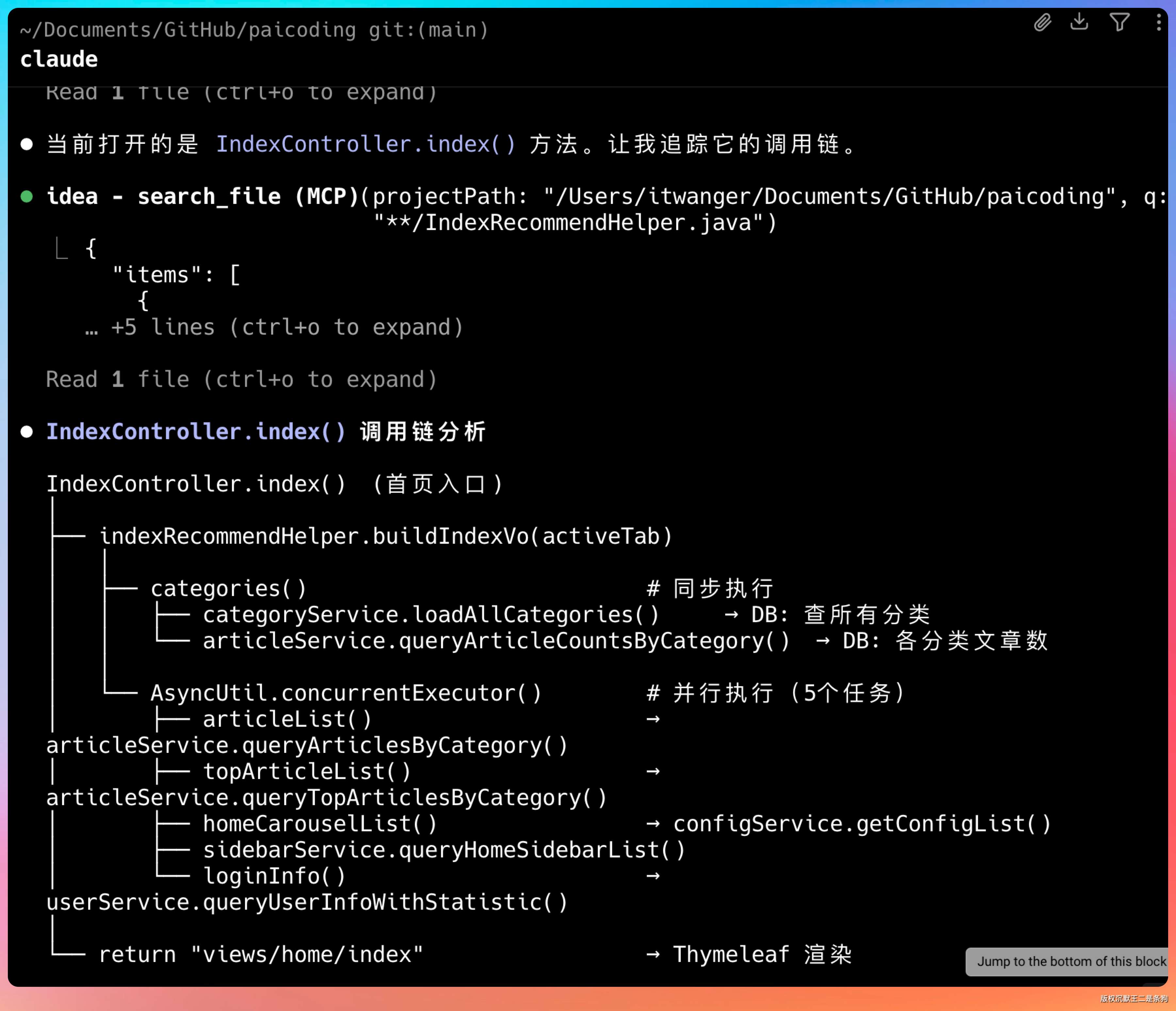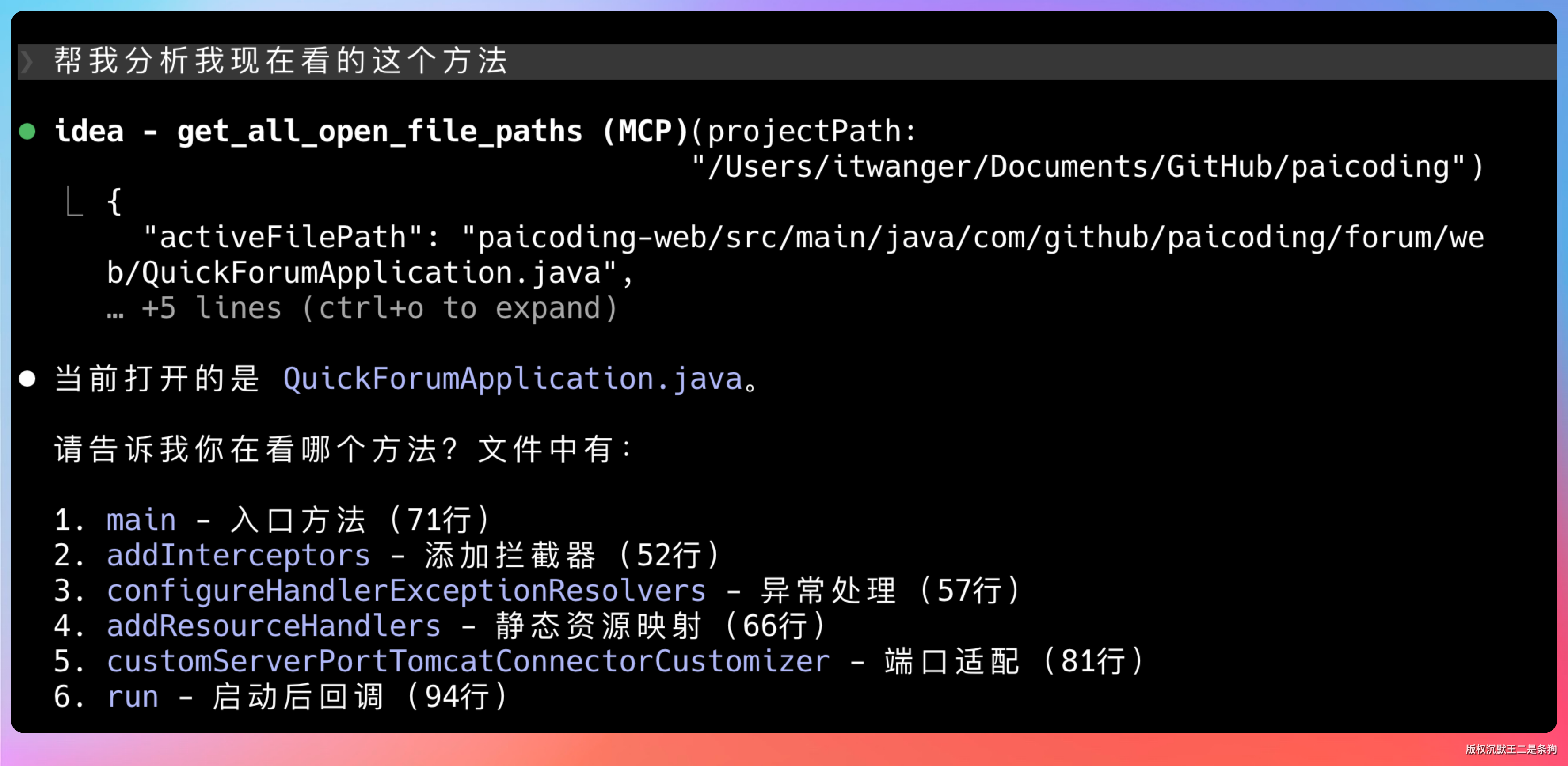 提示词:读取我当前编辑器里的方法,解释它的调用链。