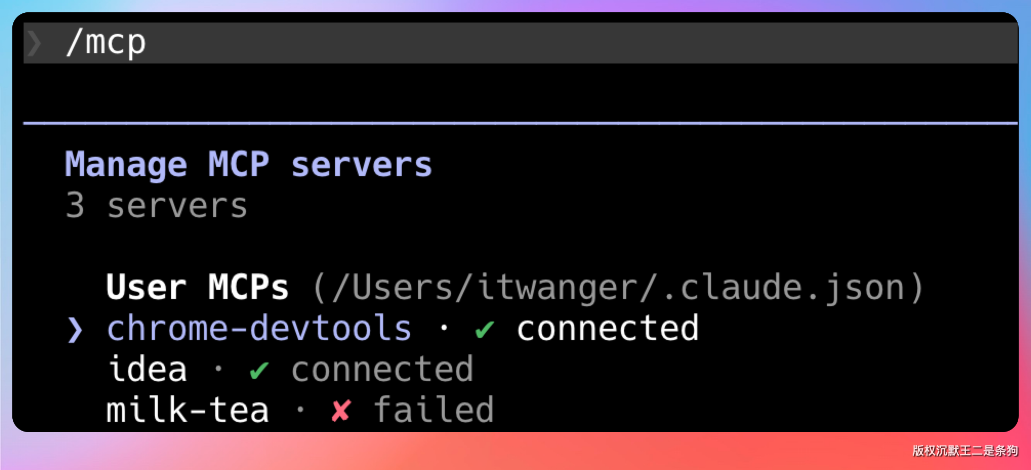 在 Claude Code 里输入 /mcp,如果看到 idea 这个服务状态是 connected,就说明配通了。