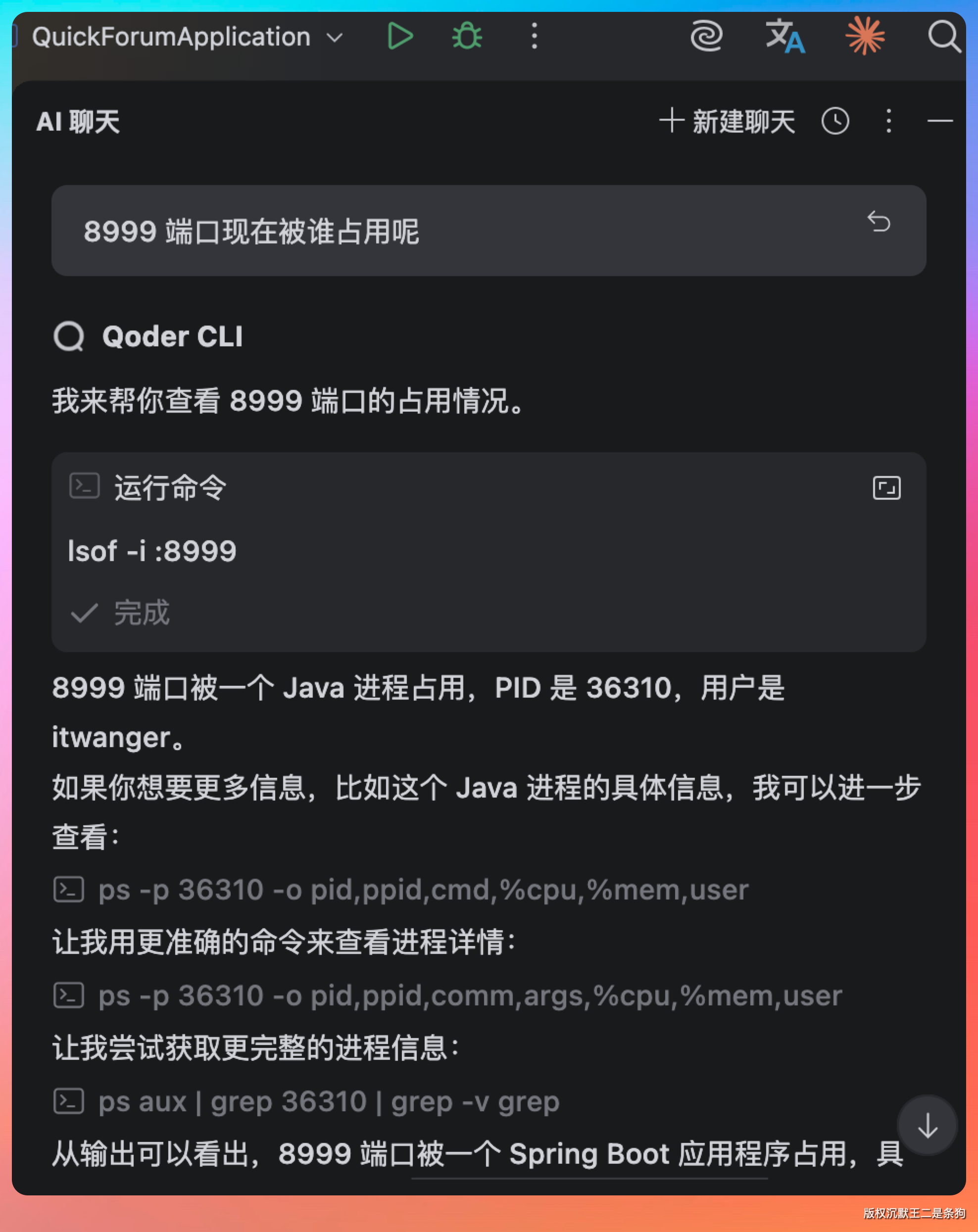 在这个入口里,可以直接完成对话,比如说我们问 8999 这个端口谁在占用,就可以自动执行 lsof -i :8999 帮我们调查。