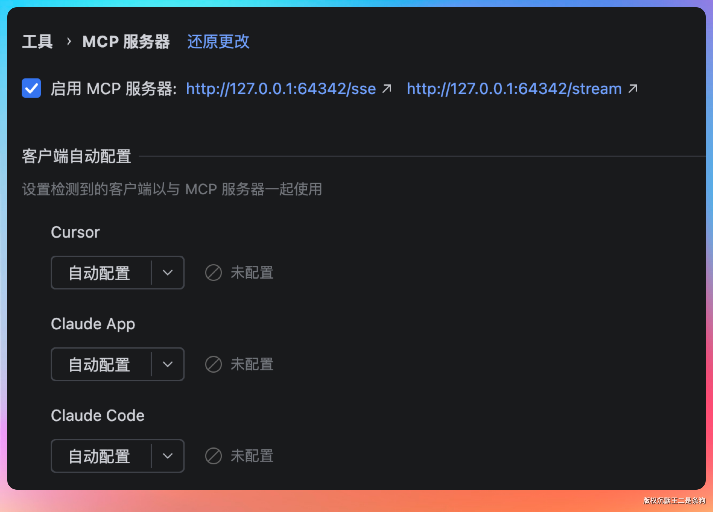 IDE 会自动生成一个本地地址,类似 http://127.0.0.1:64342/sse 这样的格式。这个地址就是 MCP endpoint。
