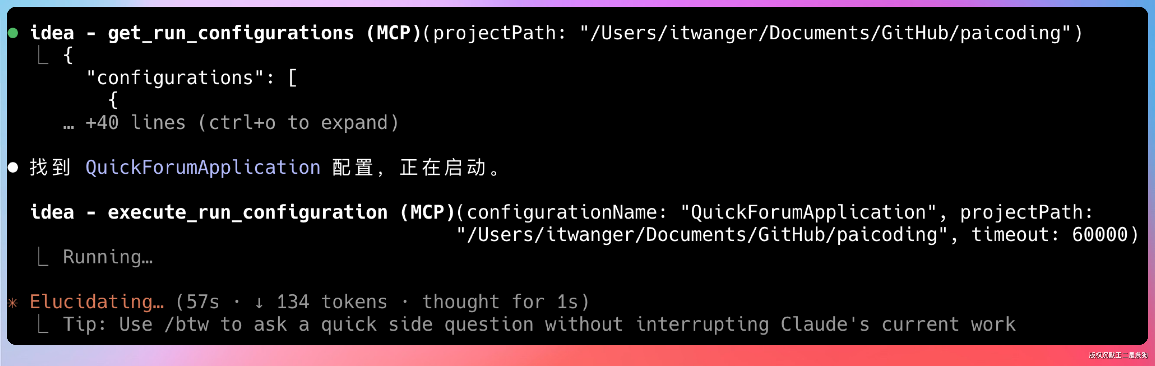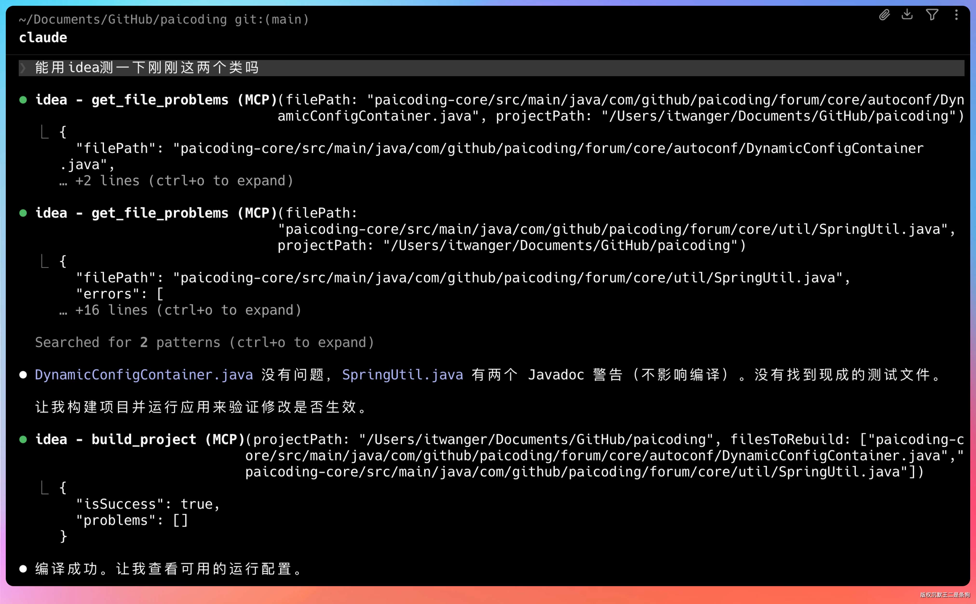 我在 Claude Code 里说:“能用 IDEA 测一下刚刚这两个类吗?”随后它就开始在 IntelliJ IDEA 中编译源码运行了。