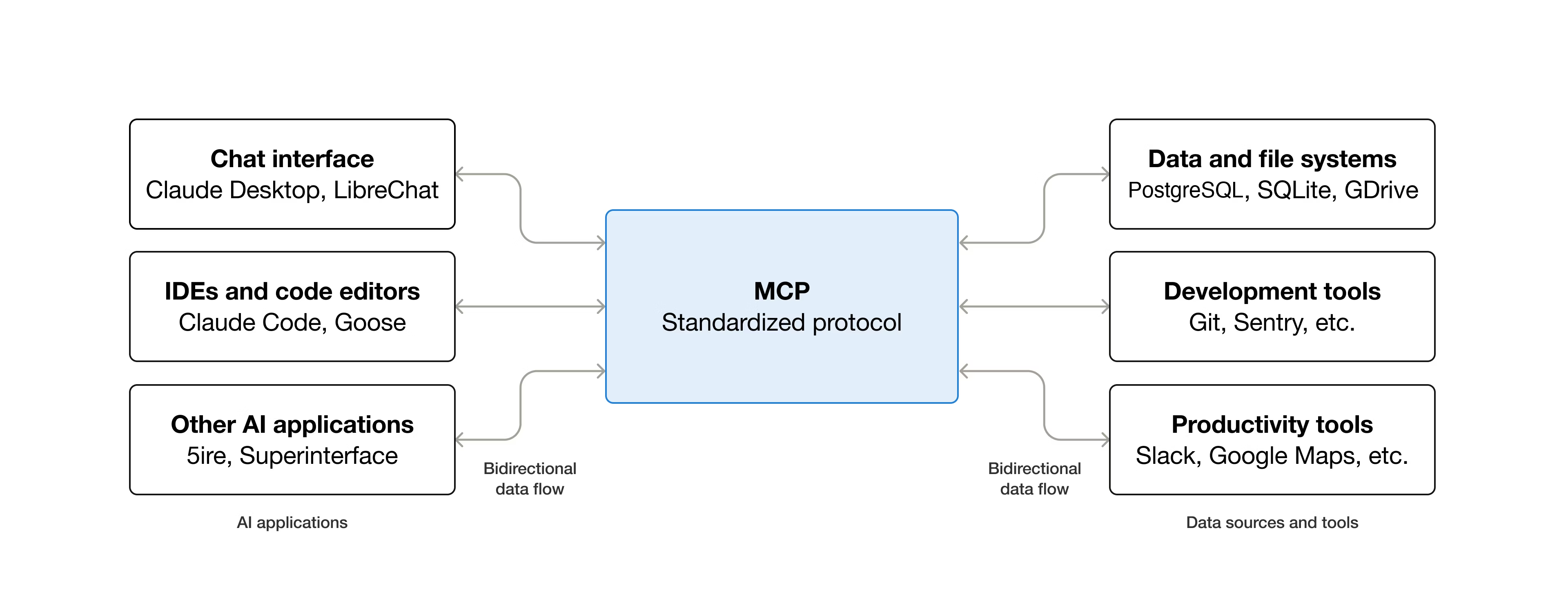 MCP,全称 Model Context Protocol,模型上下文协议。这是 Anthropic 提出的标准,目的是让 AI 模型能访问外部工具和数据源。