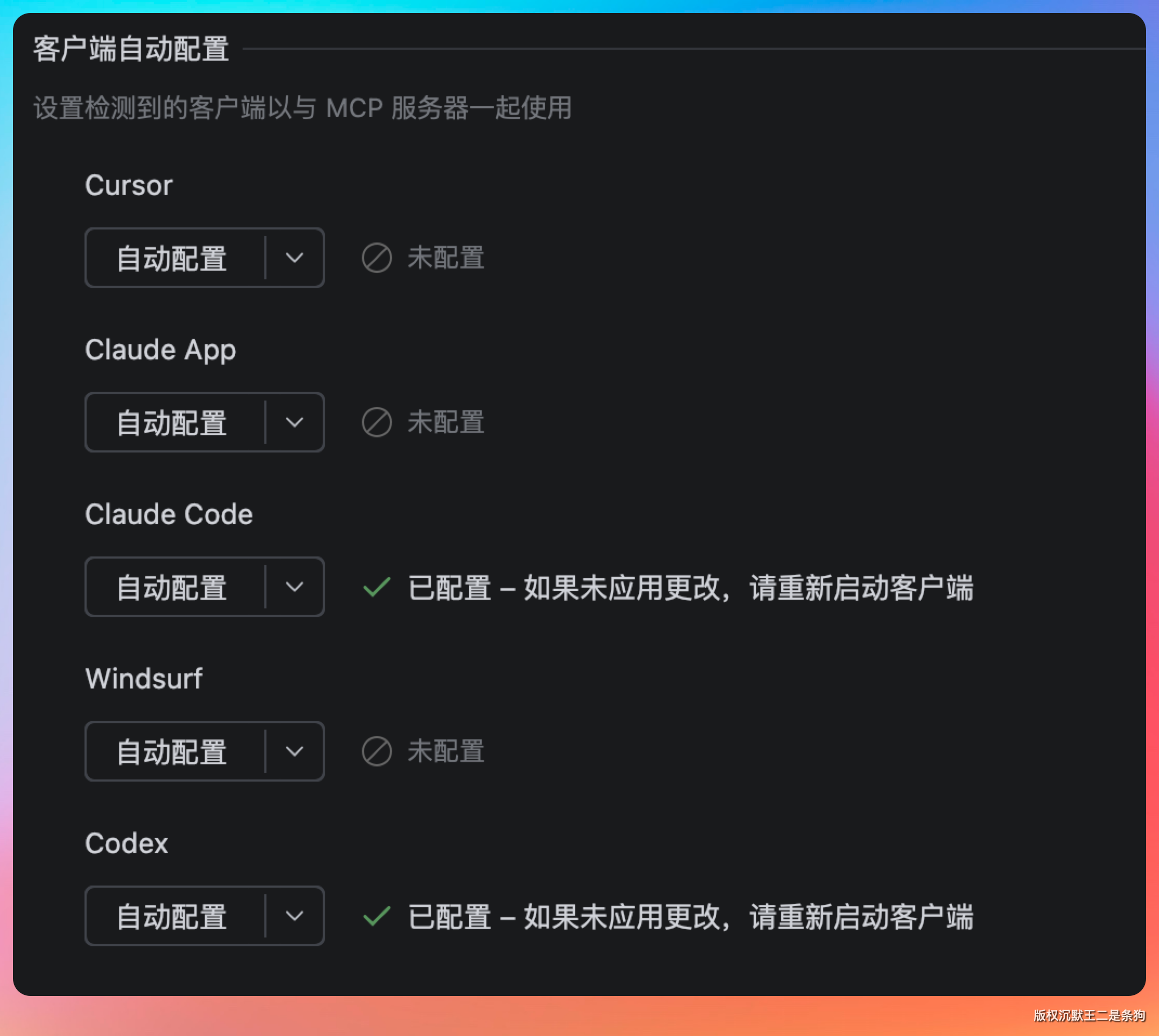 可以点击客户端自动配置,比如说我这里勾选了 Claude Code 和 Codex(IntelliJ IDEA 帮我们自动配置)。