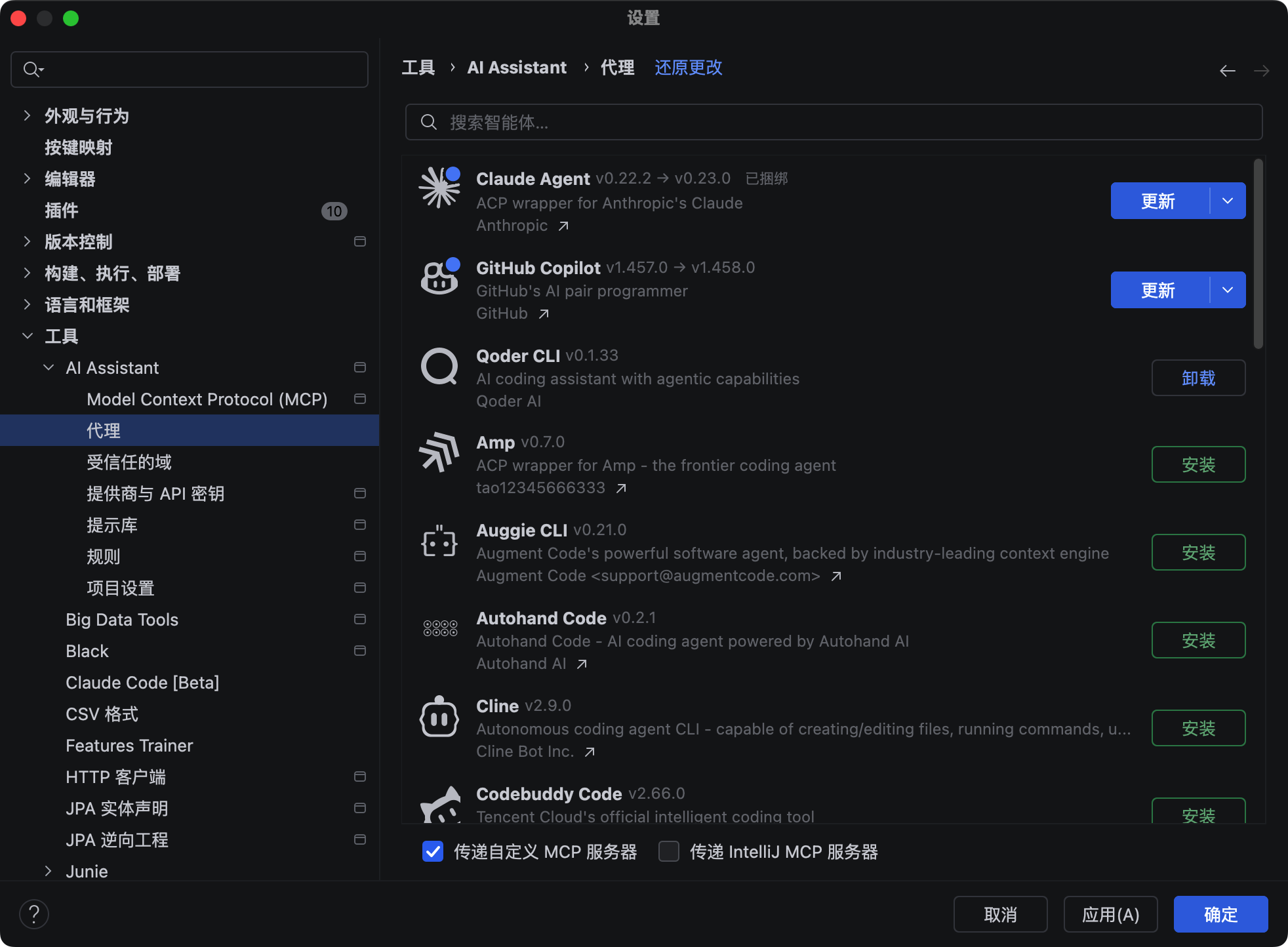 点开设置,找到代理,这里有一个 ACP 注册表,有点像插件市场,专门面向 AI Agent。