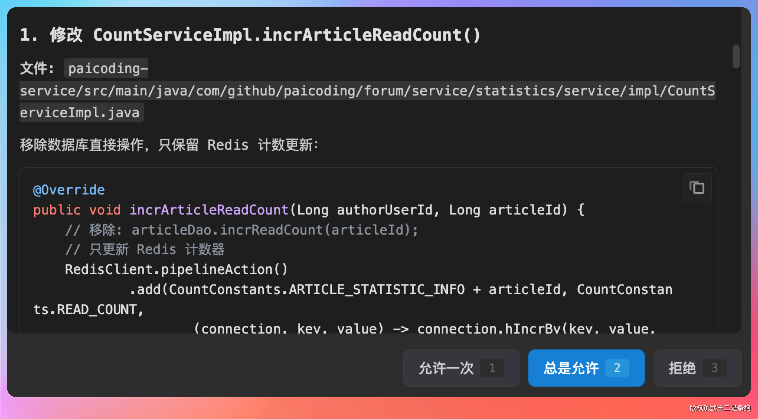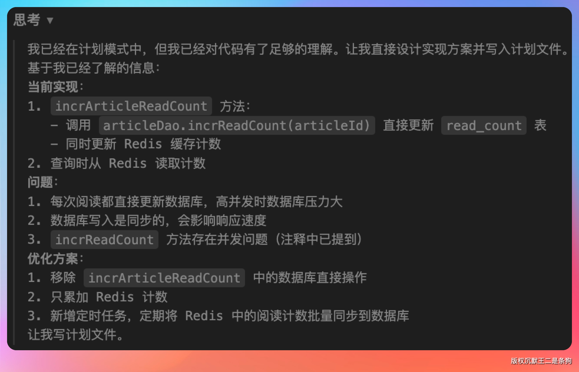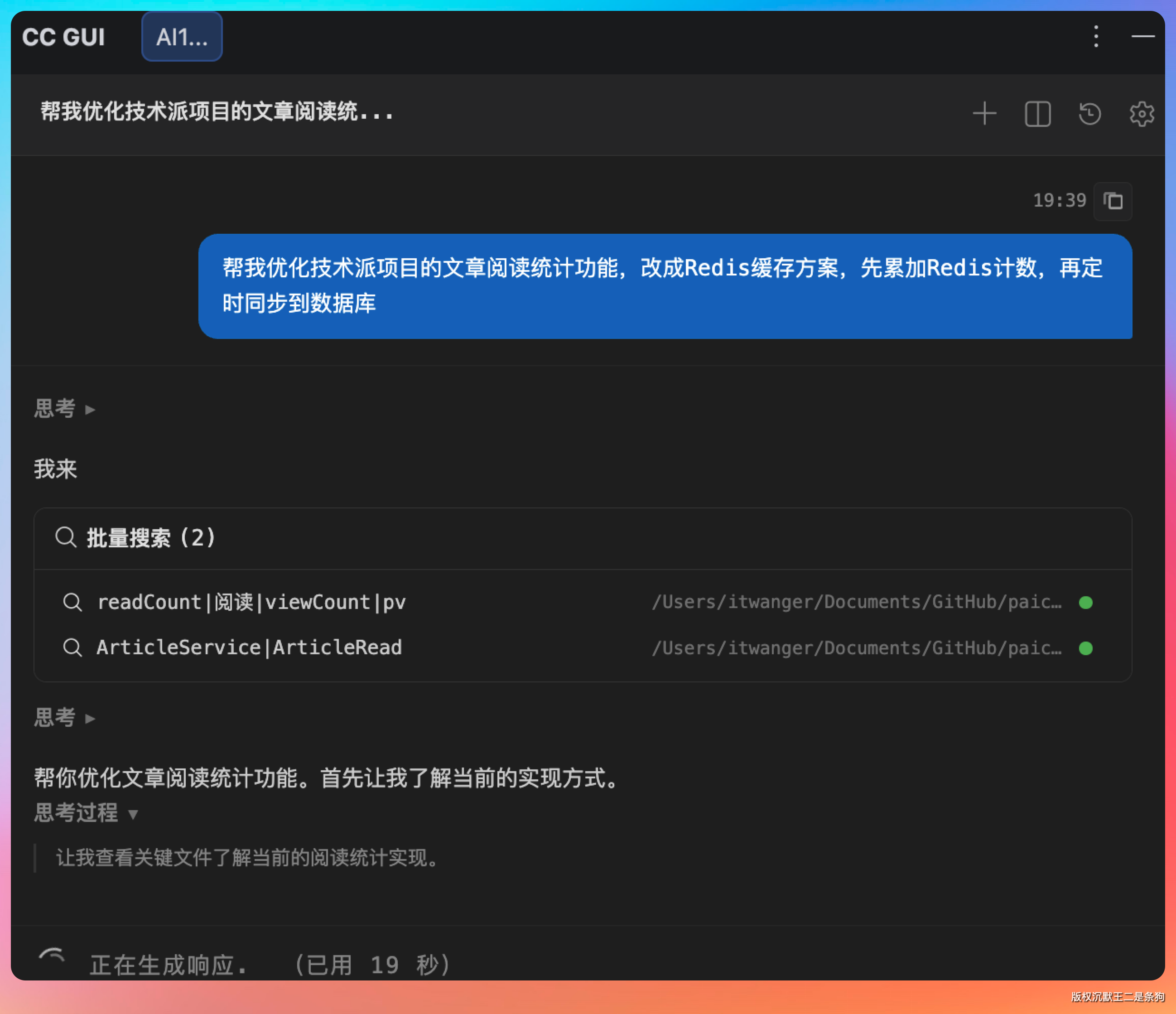我在 CC GUI 里说:“帮我优化技术派项目的文章阅读统计功能,改成 Redis 缓存方案,先累加 Redis 计数,再定时同步到数据库”。