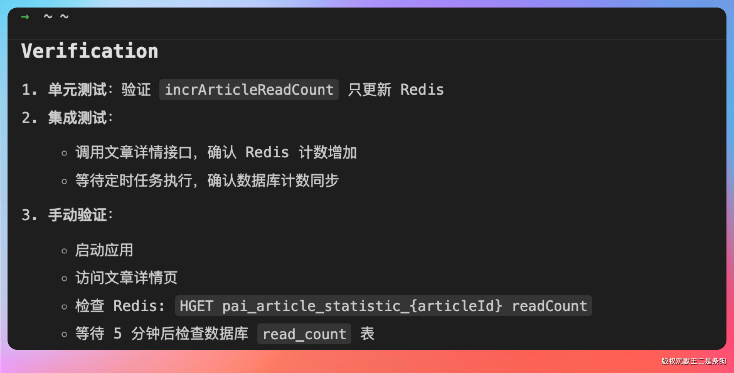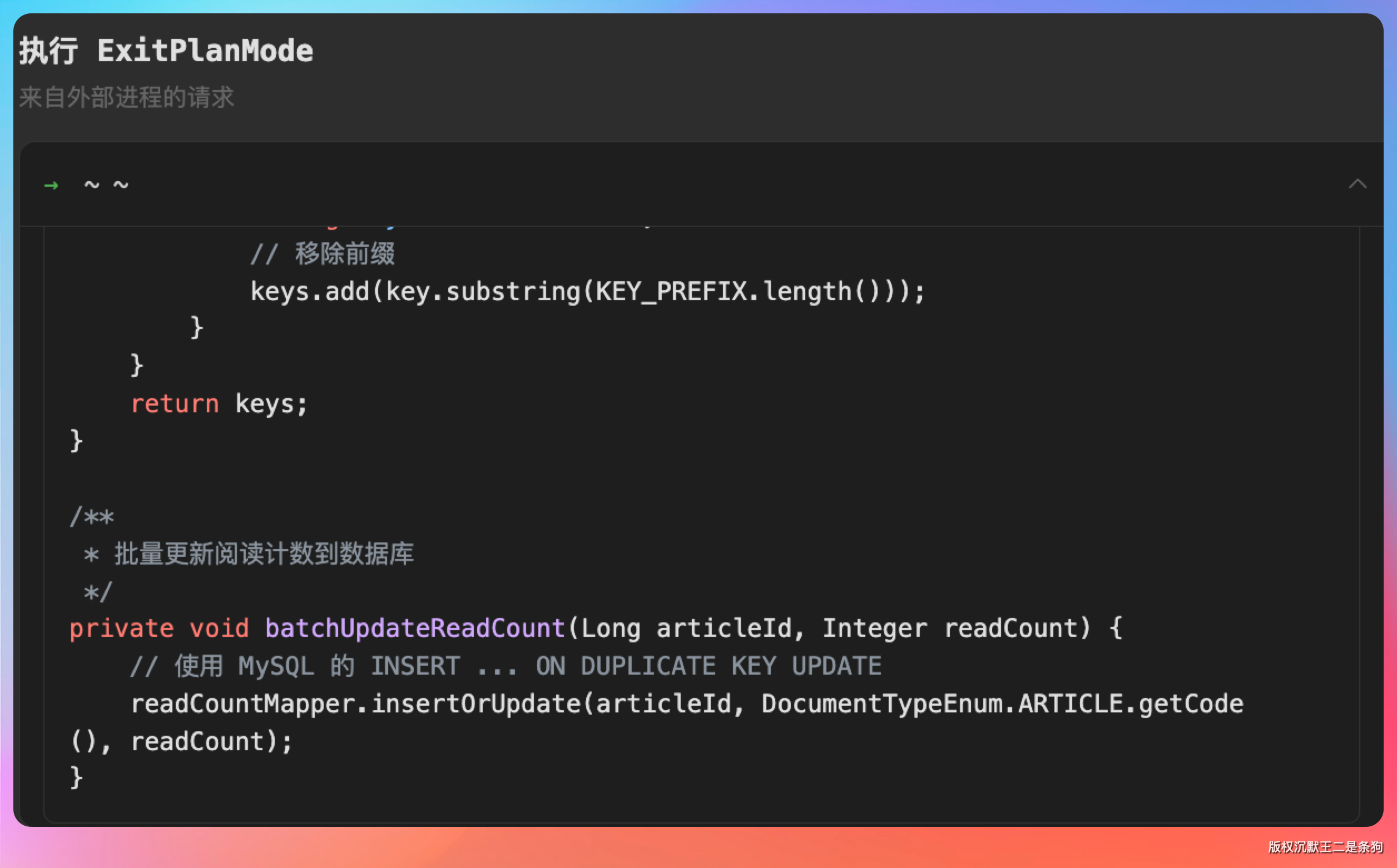 第一步,修改 CountServiceImpl.incrArticleReadCount(),移除数据库直接操作,只保留 Redis 计数更新: