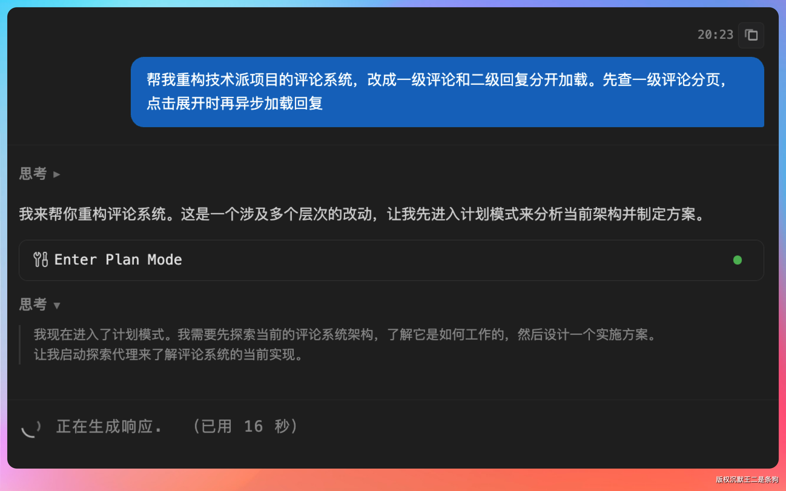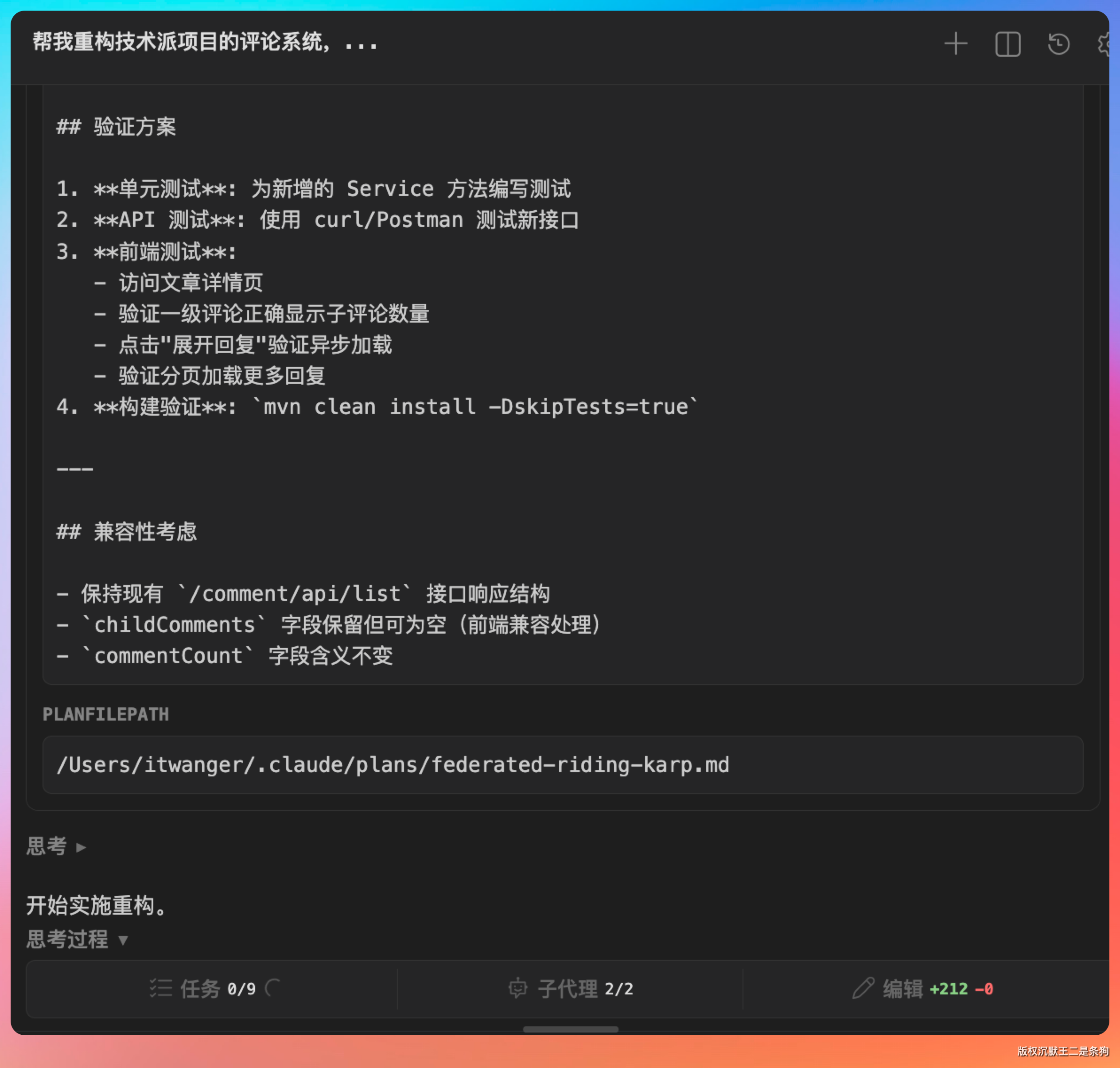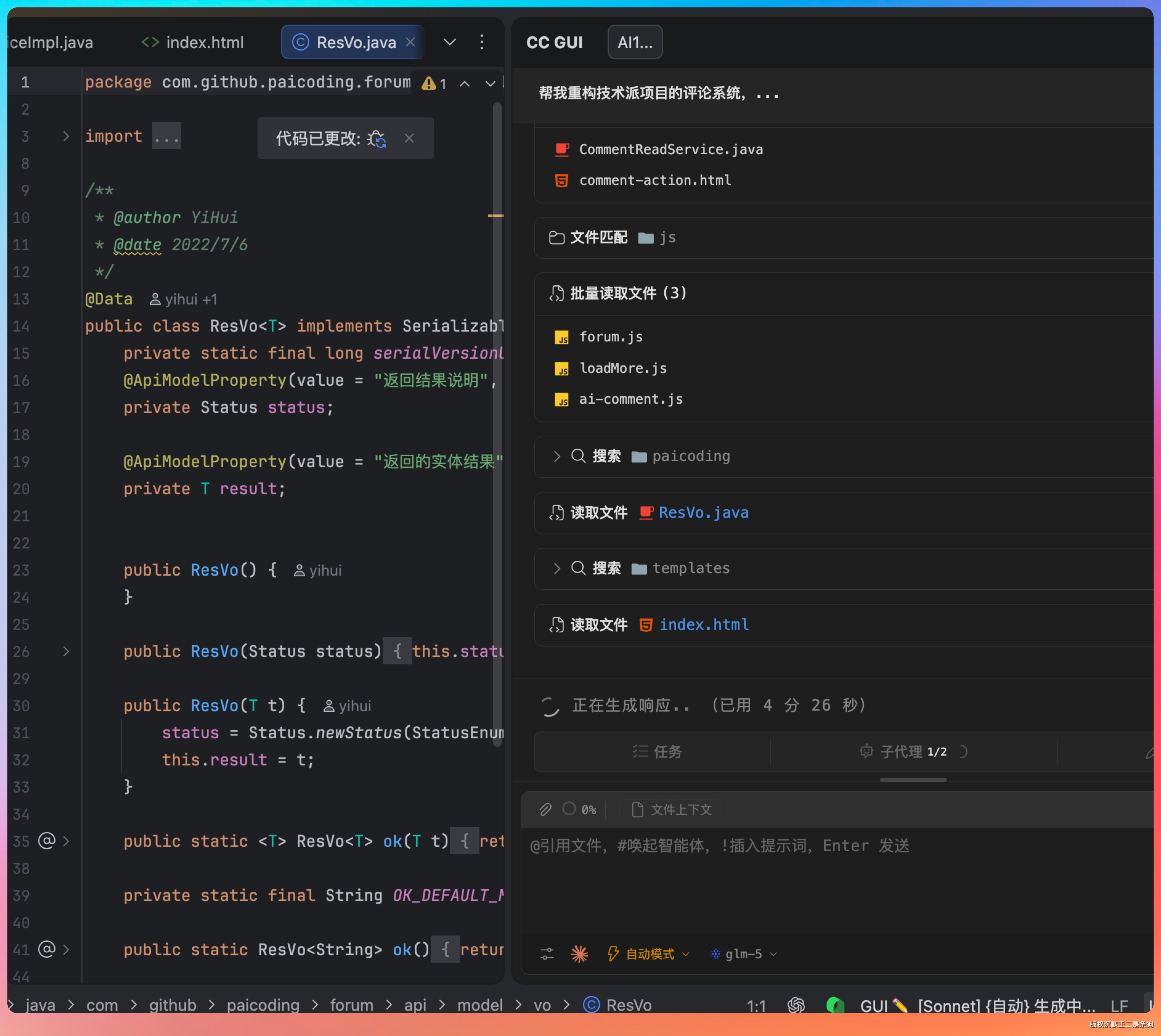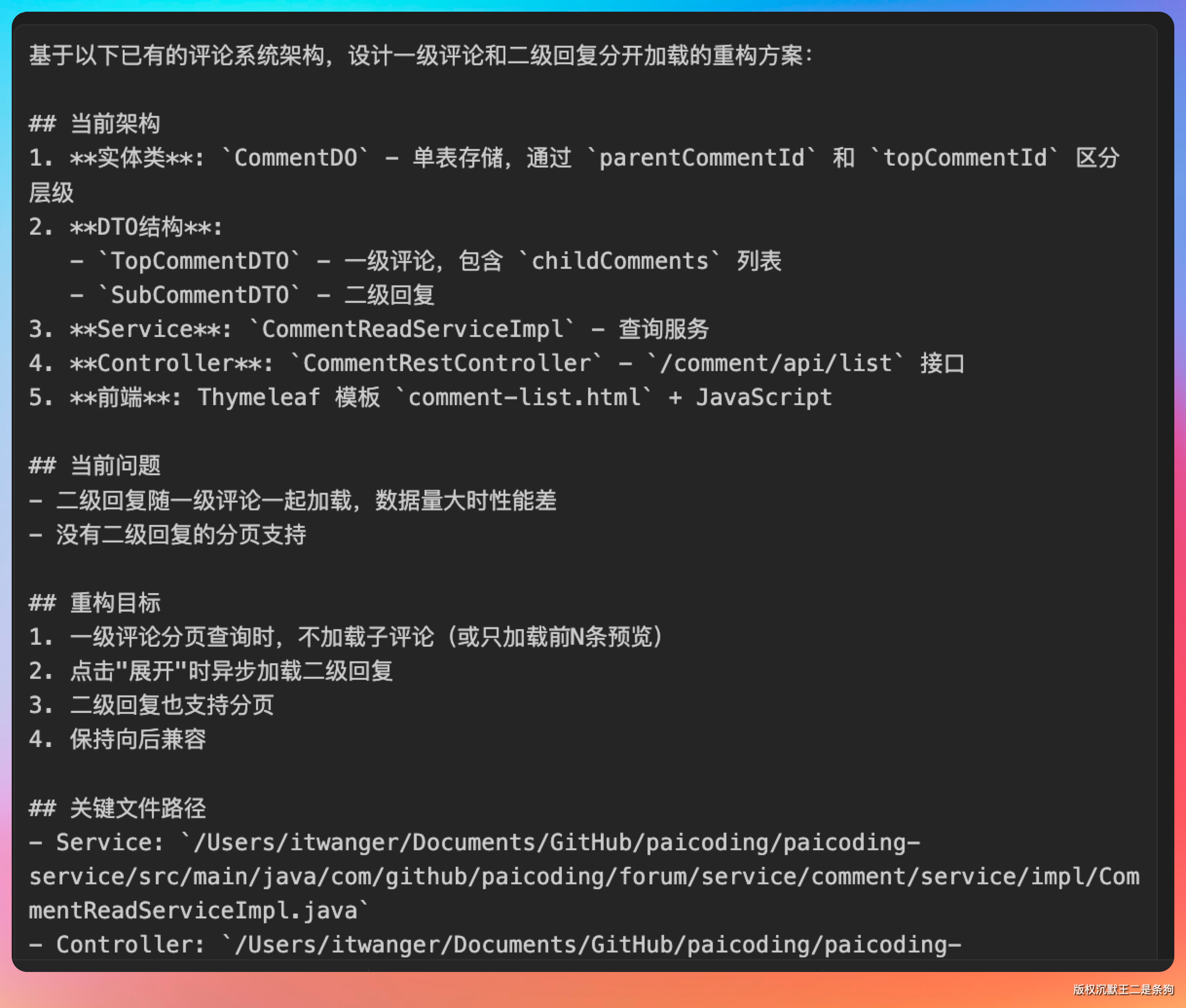 现在在 CC GUI 里,我直接说:“帮我重构技术派项目的评论系统,改成一级评论和二级回复分开加载。先查一级评论分页,点击展开时再异步加载回复”。