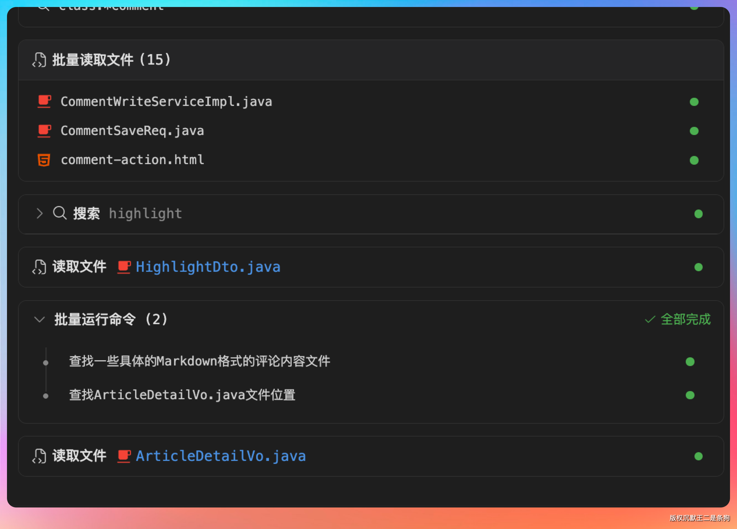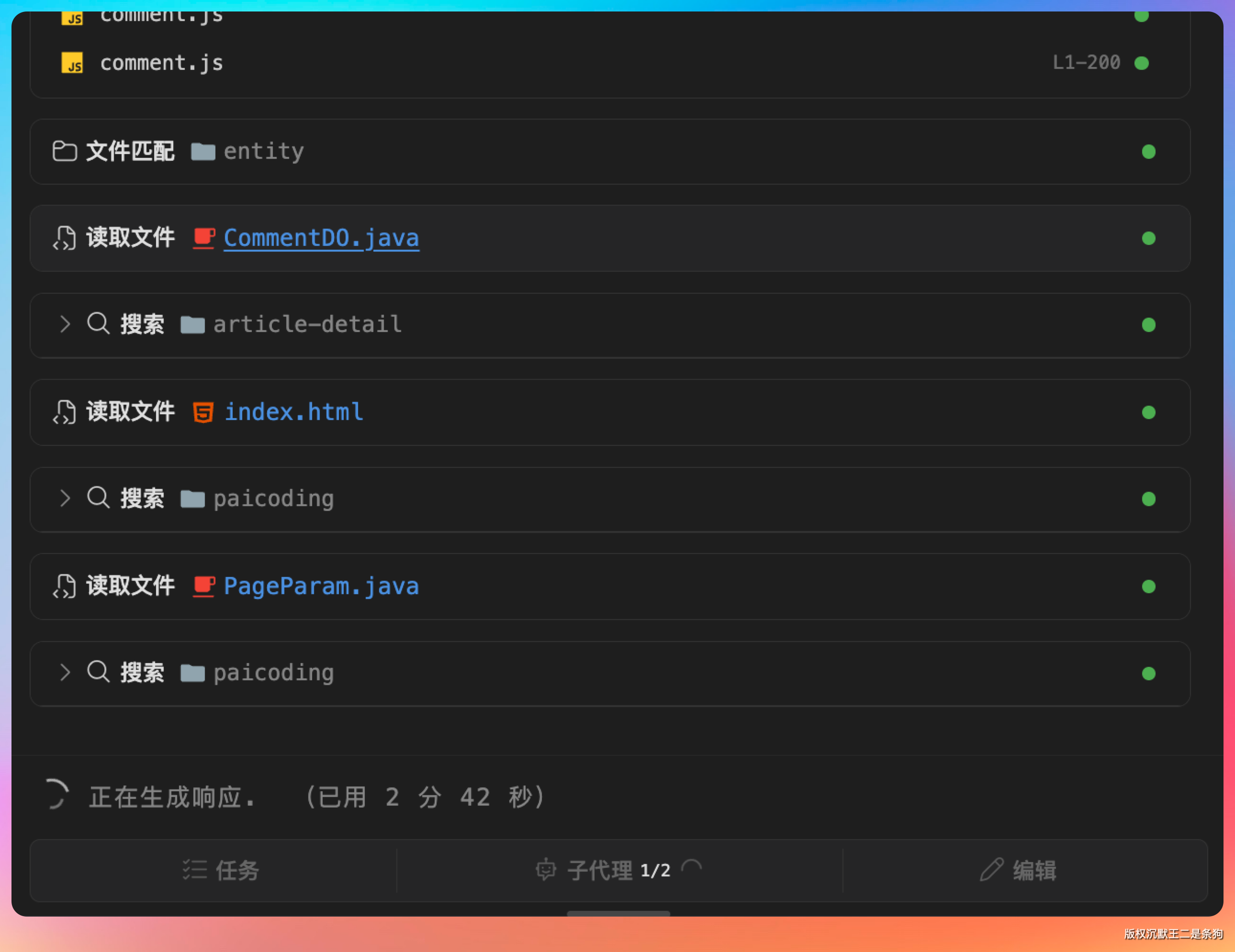 整个过程我只用确认关键步骤,具体的代码编写、文件创建、方法调用关系,Agent 都帮我处理好了。