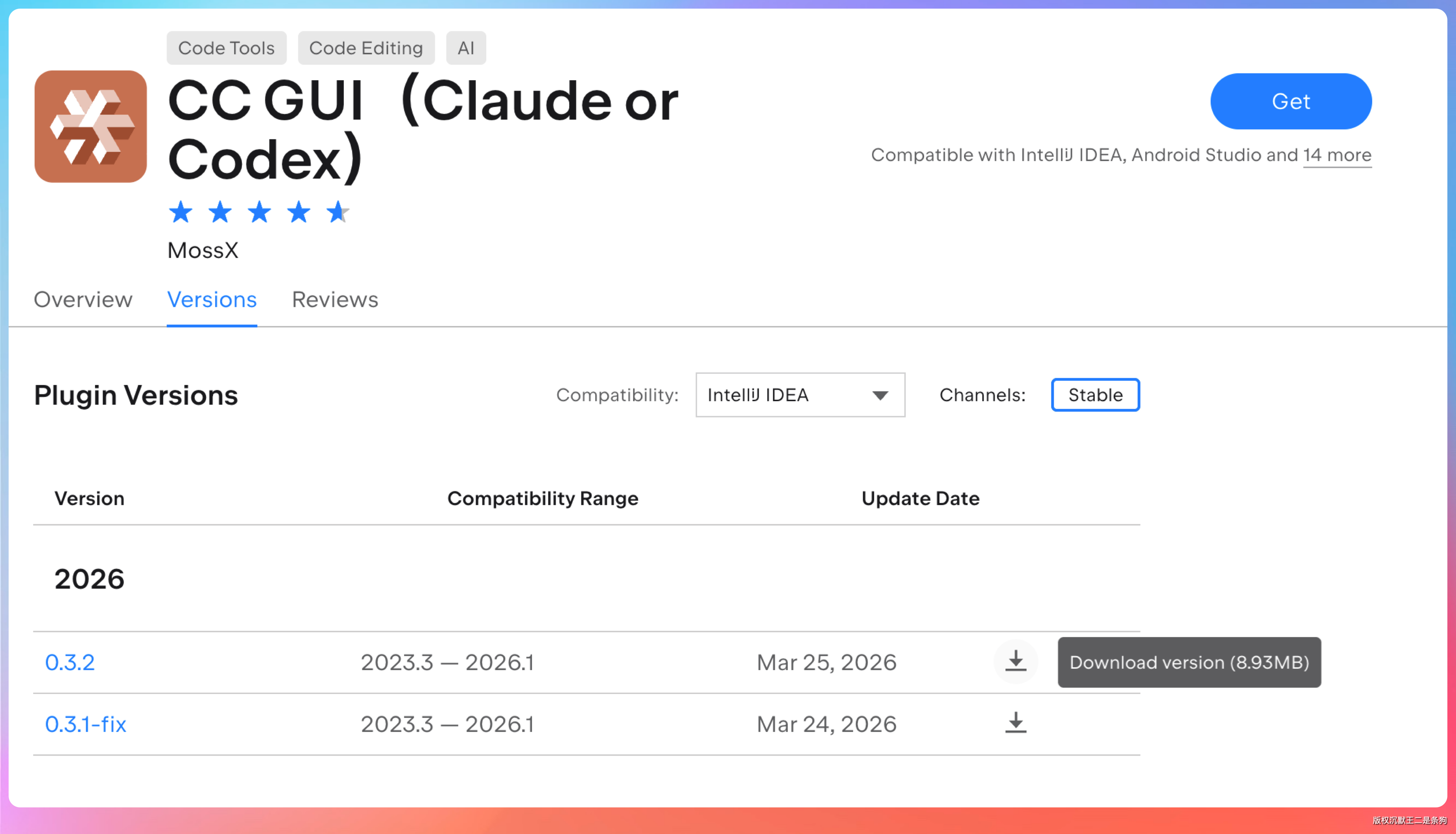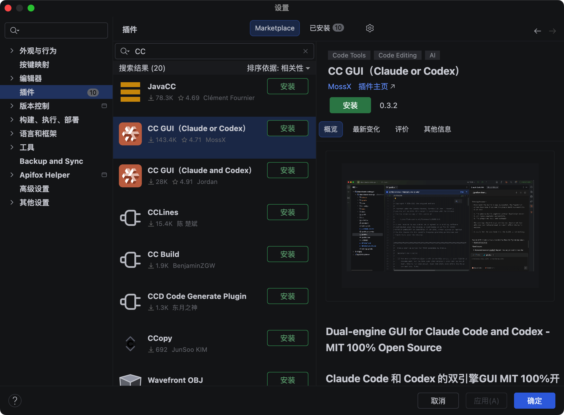 打开 IntelliJ IDEA,进入插件市场(快捷键 Cmd+Shift+A,然后输入 Plugins),搜索 “CC GUI”,这里能看到有两个图标完全一样,但作者不一样的插件。
