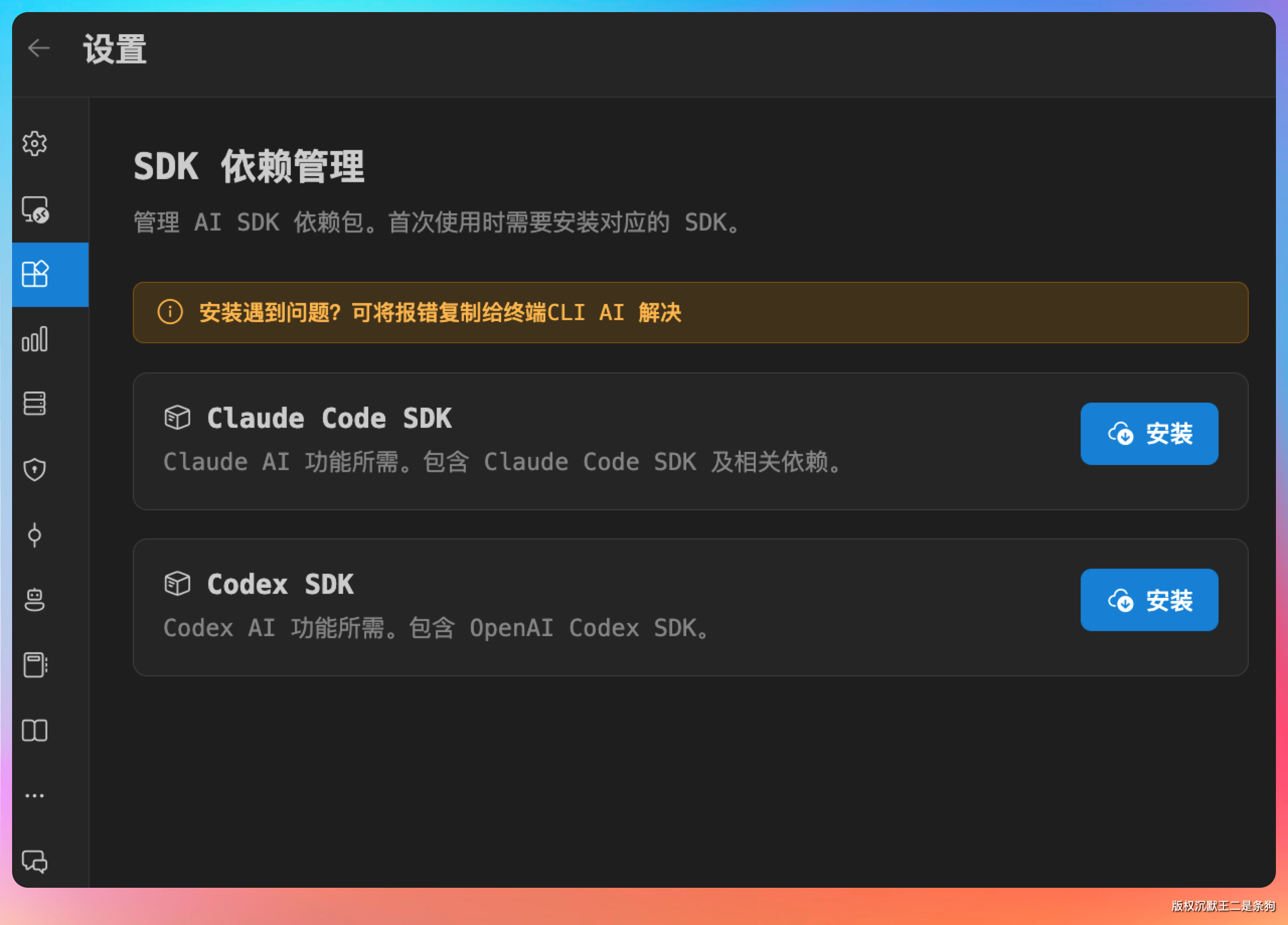 首次使用会提醒我们安装 Claude Code SDK,点击前往安装。这个 SDK 是 Agent 运行的基础,大概 20 秒就能装好。