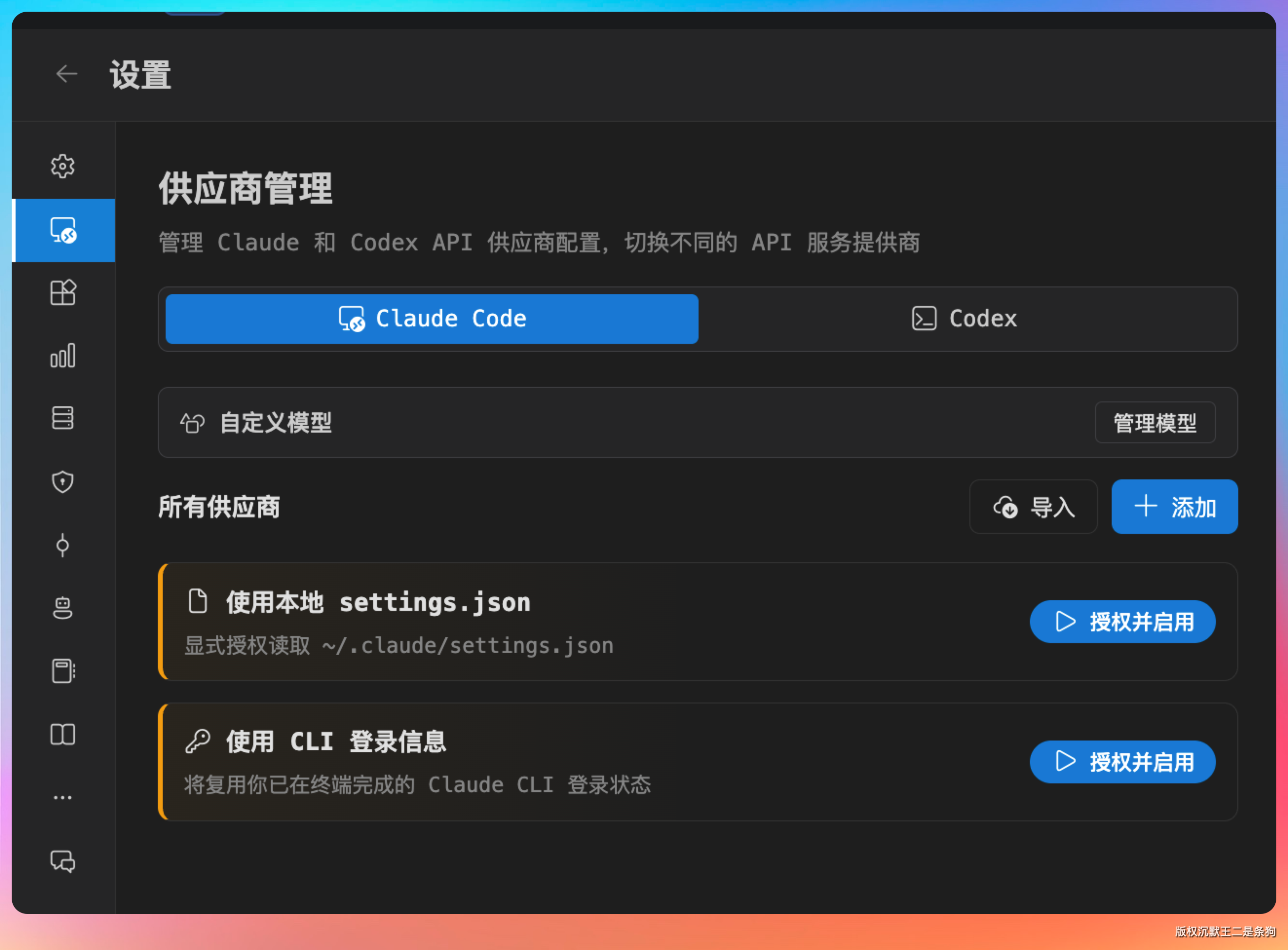 这里可以直接用本地的 settings.json 授权。如果你之前配置过 Claude Code,直接把配置文件路径填进去就行。这样如果你用的是国内的 Coding Plan 套餐,比如说 GLM-5、Kimi 2.5 之类的,就可以直接用,不用再去登录 Claude 官方账号。