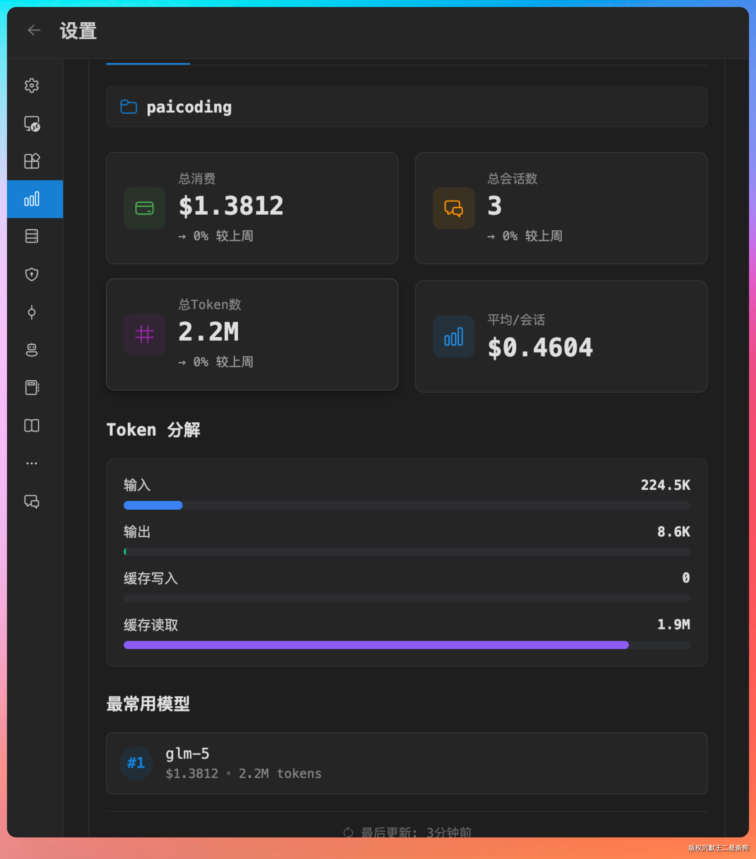 配置好后,在统计面板可以看到 token 的使用情况,包括每次请求的 token 数和累计使用量。