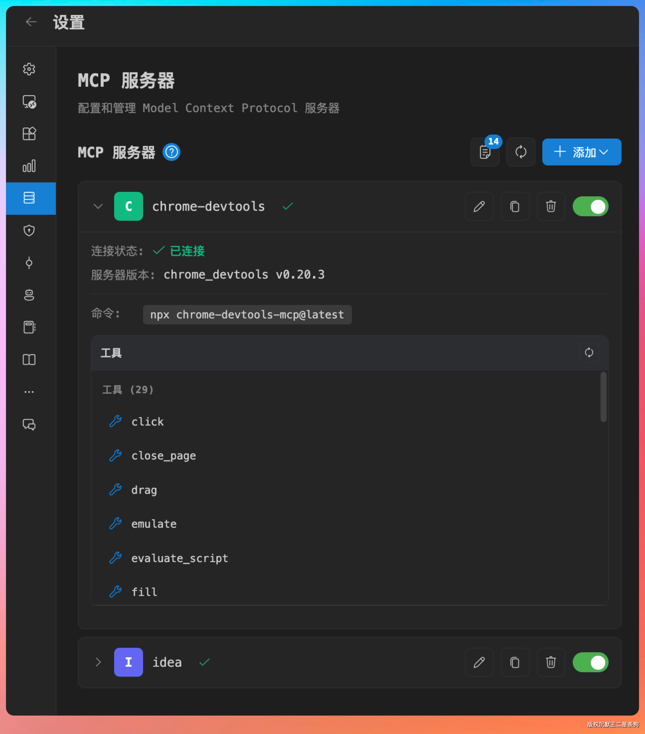强烈推荐大家安装 Chrome Devtools 这个 MCP,它可以让 Agent 直接调用 Chrome 浏览器,帮我们做前端测试和调试。针对一些需要登录态才能复现的 bug,或者需要特定浏览器环境的问题,这个超级好用。