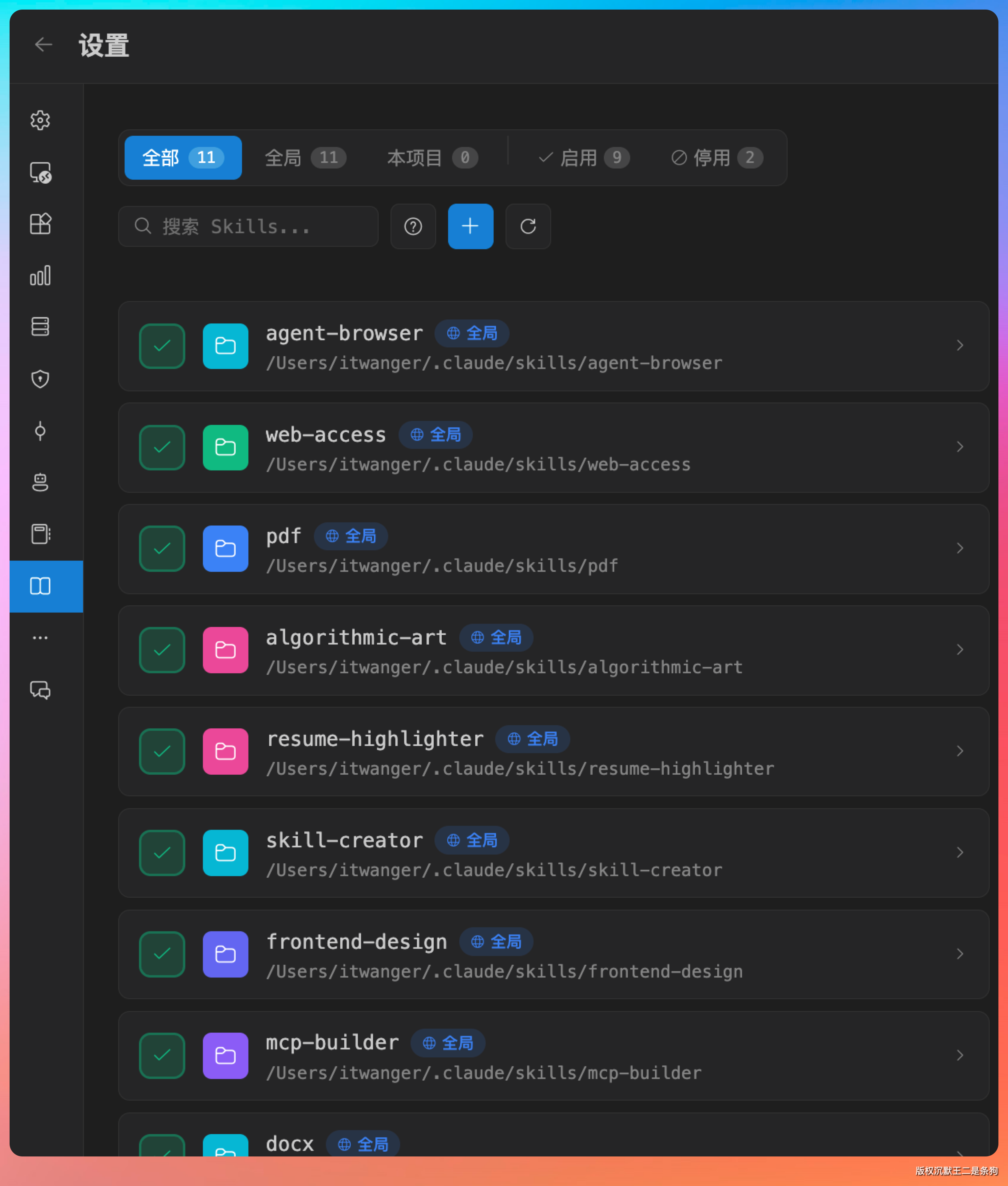 接下来,重点可以看一下 Skills 面板。Skills 是 Claude Code 的扩展能力包,相当于插件,可以让 Agent 完成特定领域的任务。