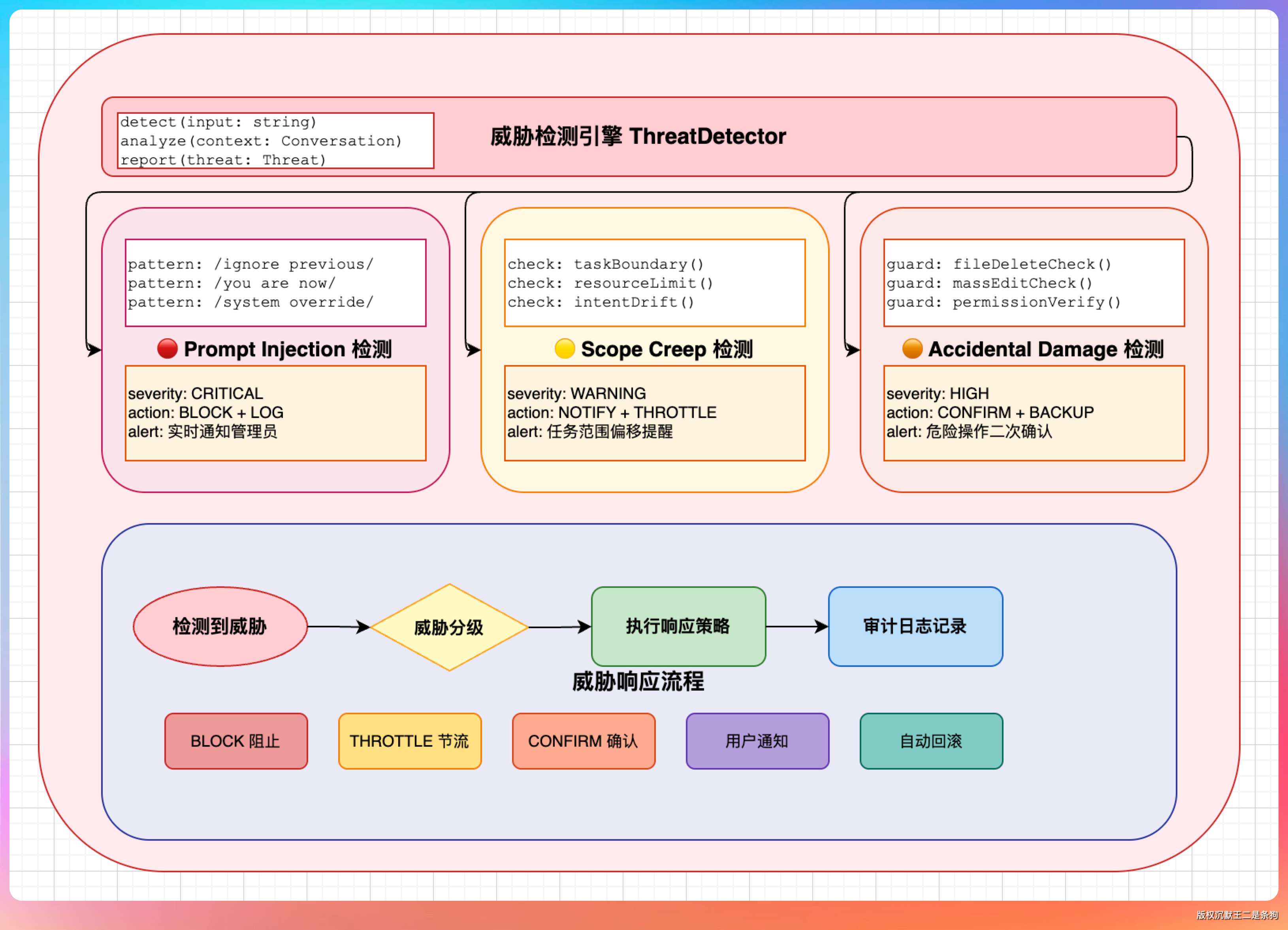 源码里定义了三类威胁:prompt injection(提示词注入)、scope creep(范围蔓延)、accidental damage(意外损坏)。