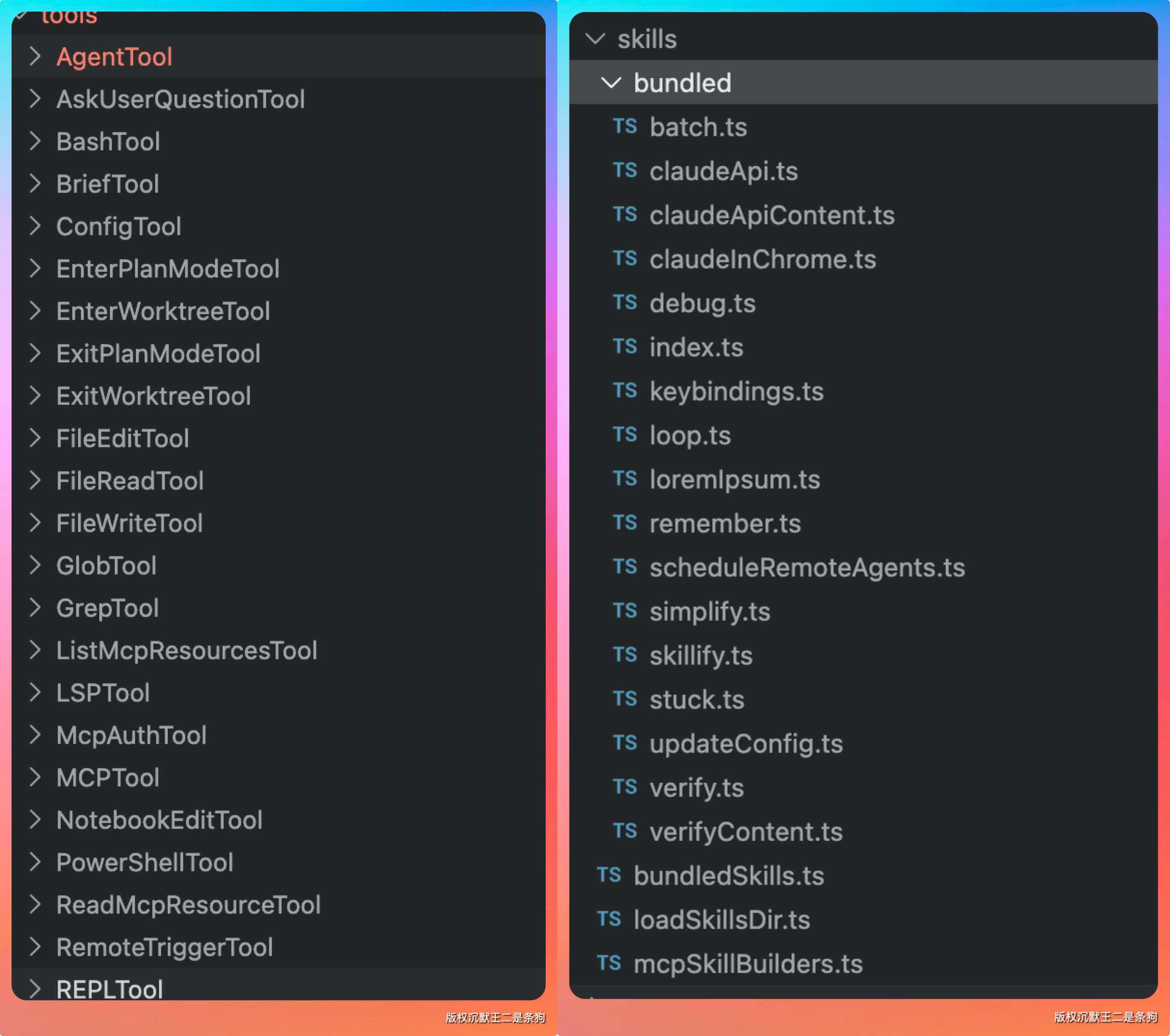 skills/bundled 目录里有 17 个内置 Skills,包括 remember、stuck、loop、batch、debug 等。