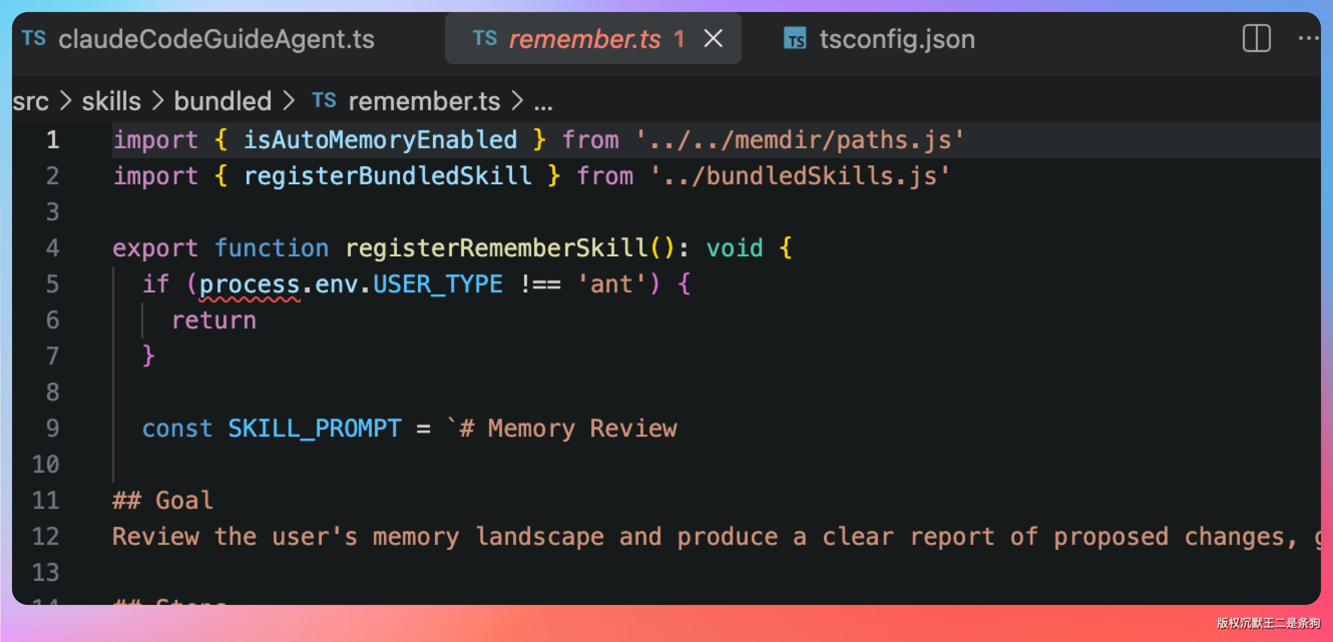 比如 remember 这个 Skill,用来管理自动记忆系统,只有 USER_TYPE === 'ant' 才能使用。stuck 这个诊断卡死会话的 Skill,也是内部专属。