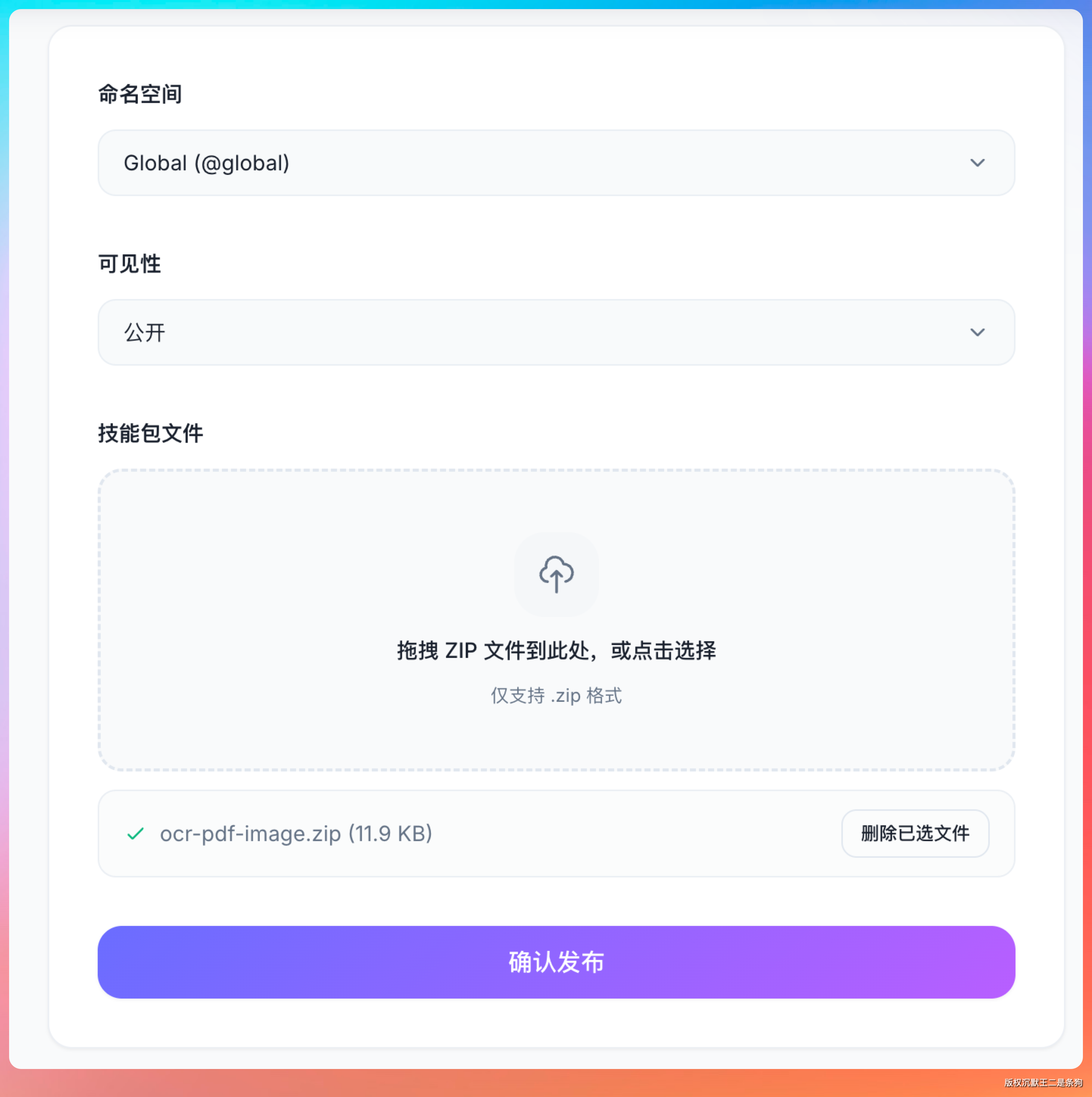 发布技能可以通过 Web 界面上传,也可以通过 CLI 工具。对于需要集成到 CI/CD 流程的场景,CLI 方式更合适。