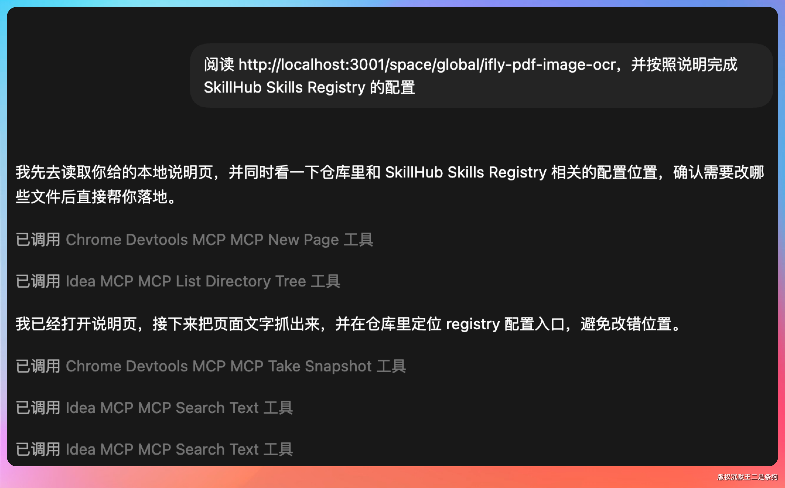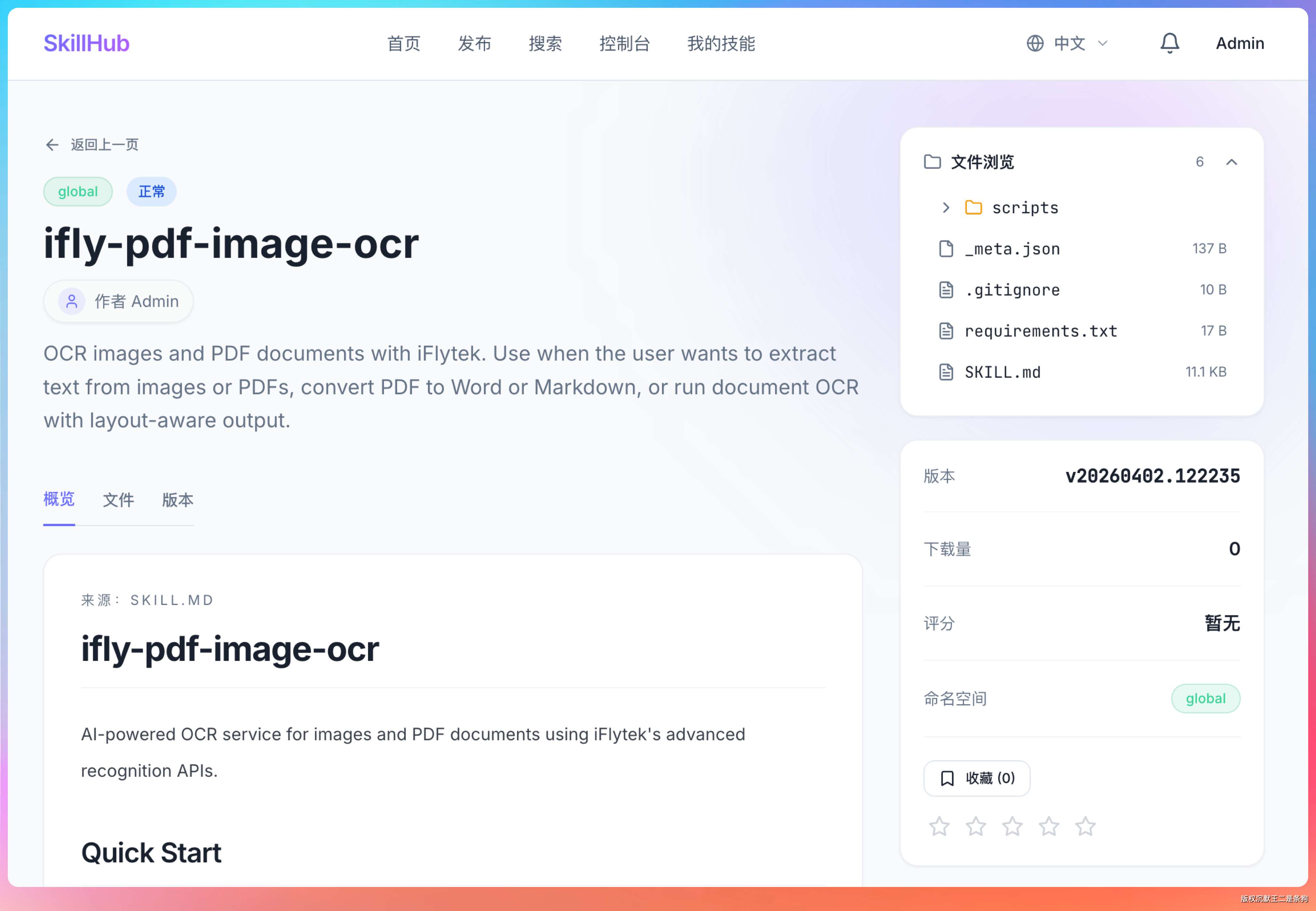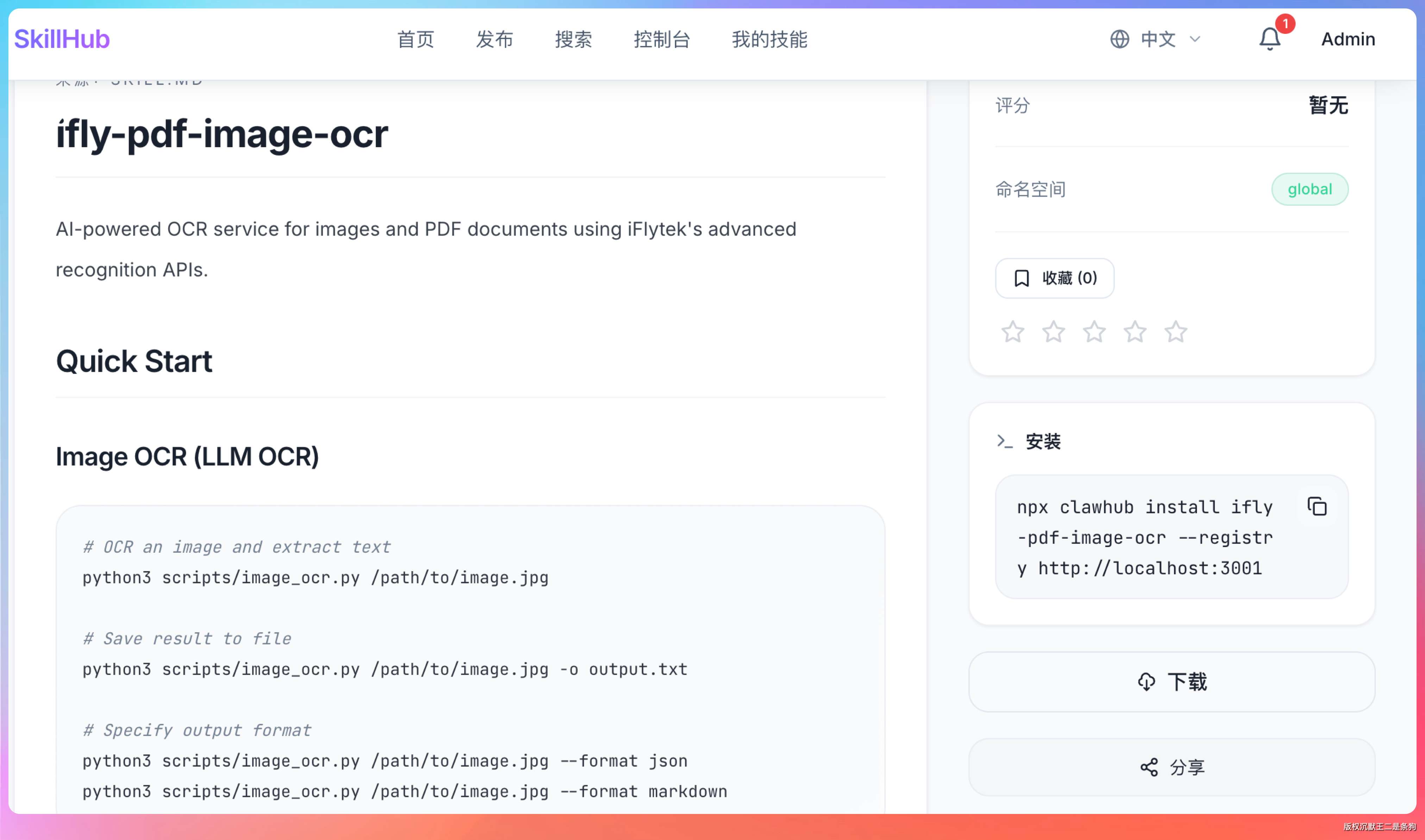 阅读 http://localhost:3001/space/global/ifly-pdf-image-ocr,并按照说明完成 SkillHub Skills Registry 的配置
