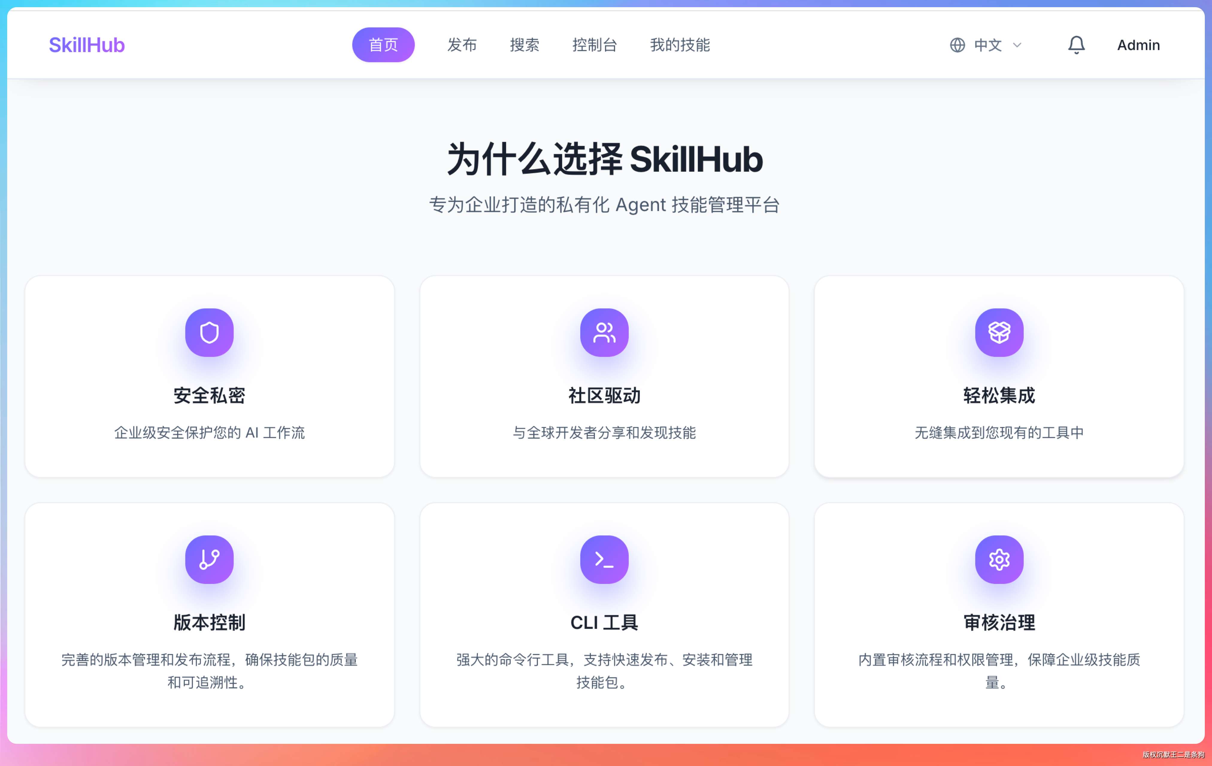 企业需要什么?私有部署、权限管理、审核流程、数据主权。这些需求,公有平台满足不了,但 SkillHub 满足得了。