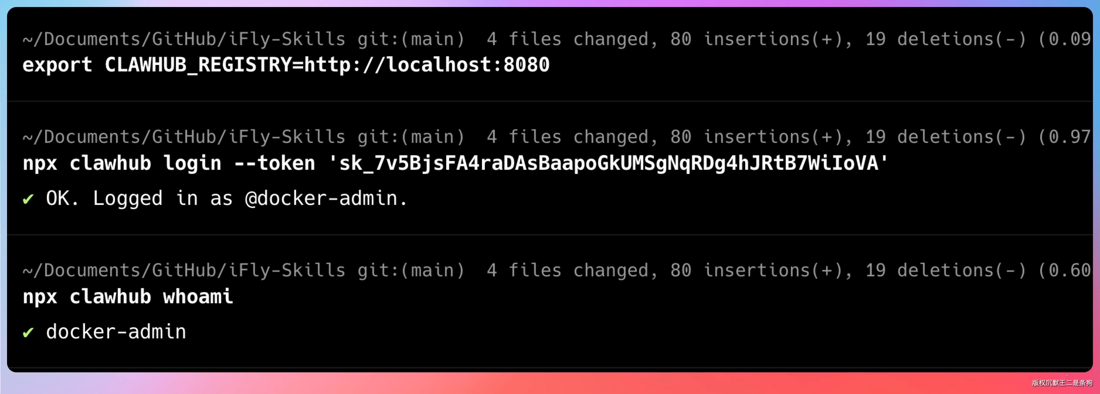 接下来回到终端,把 clawhub 指向我们之前跑起来的 SkillHub。