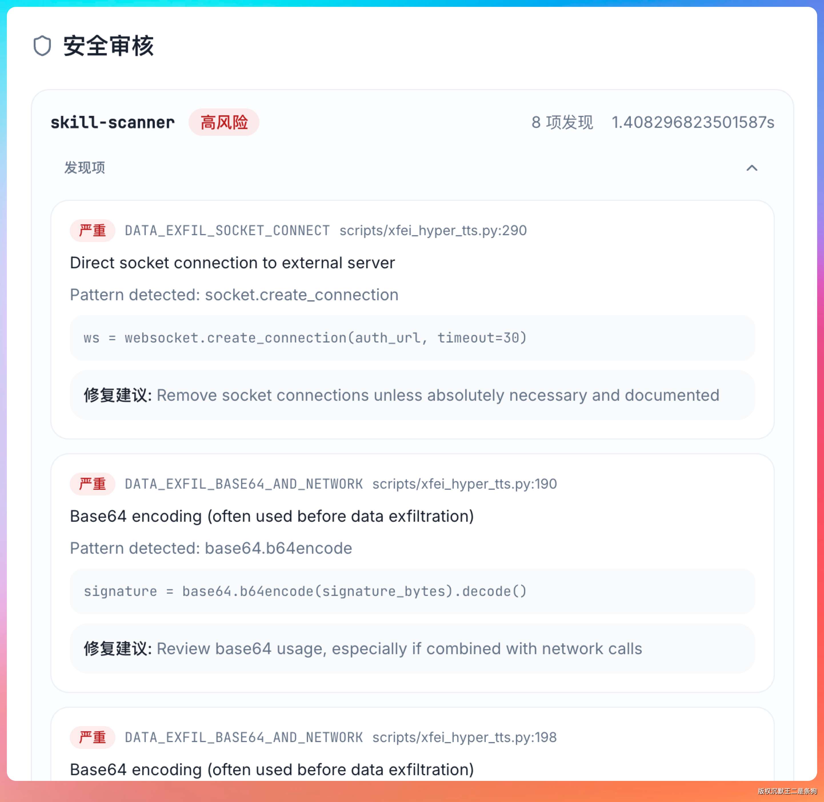 技能包上传后,系统会自动解压并进入审核队列。后台有一个独立的扫描服务,会对技能包进行多维度的安全检查。