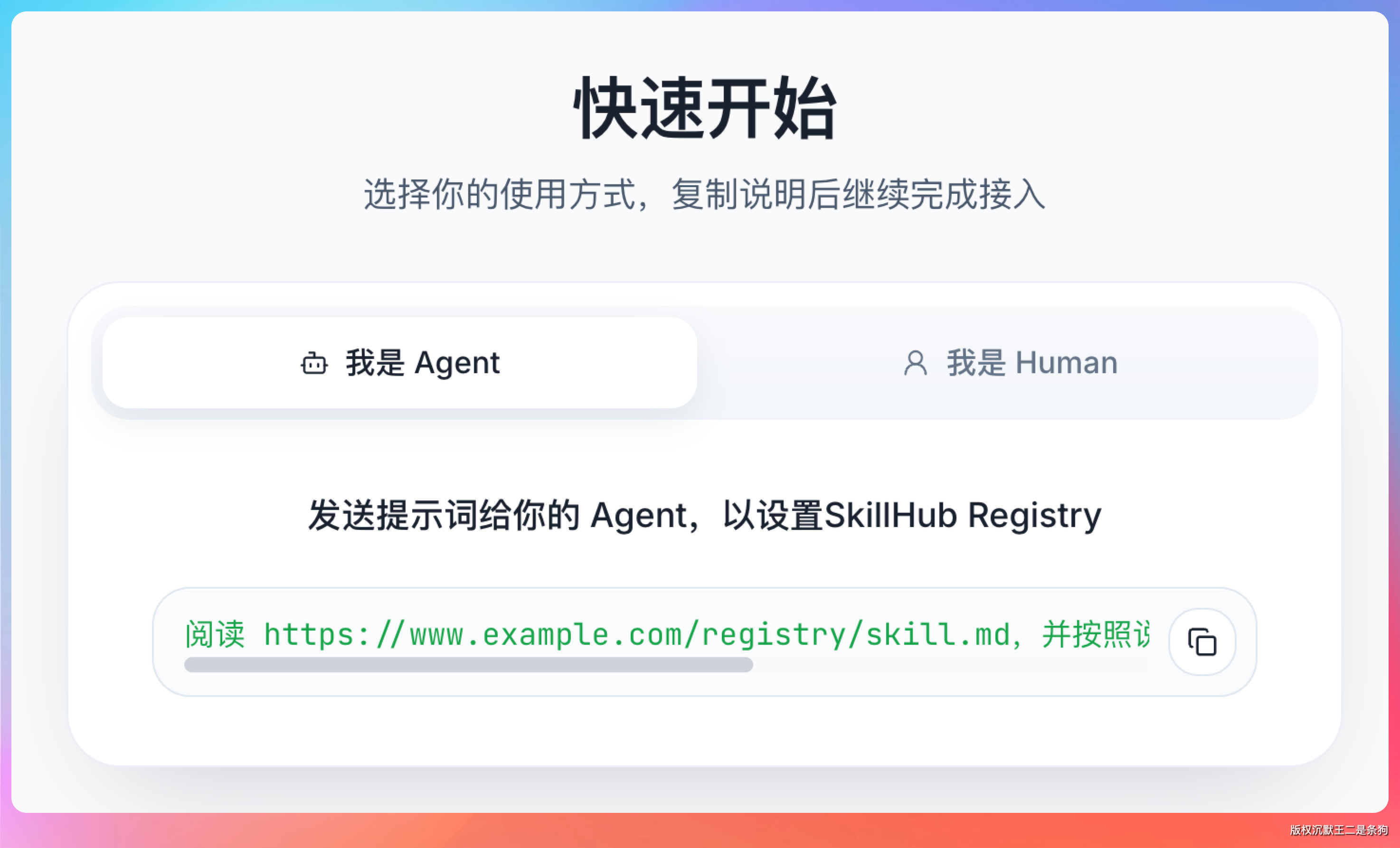 一是“注册中心”模式的运用。npm 证明了注册中心模式在软件分发上的成功,SkillHub 把这个模式引入 AI Agent 领域。