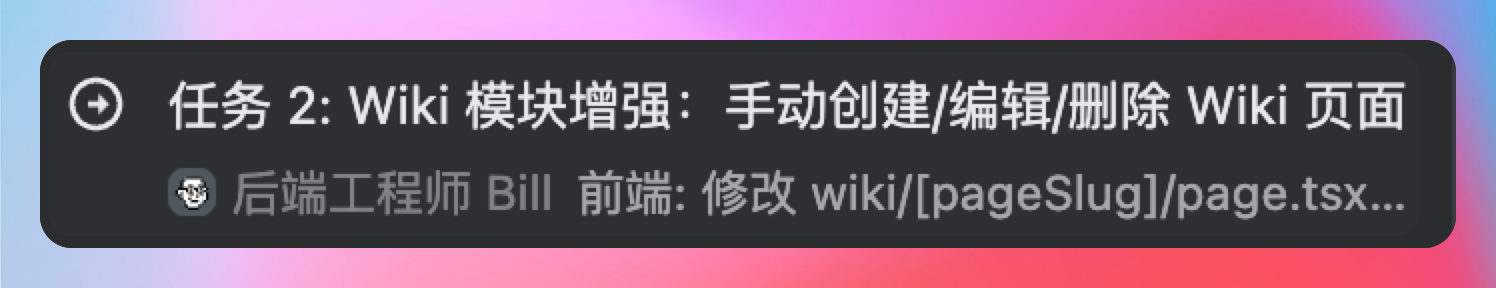 可能 Experts Mode 嫌一个后端工程师进度慢,又拉了 Bill 进来,负责任务2:Wiki模块增强,手动创建/编辑/删除Wiki页面。