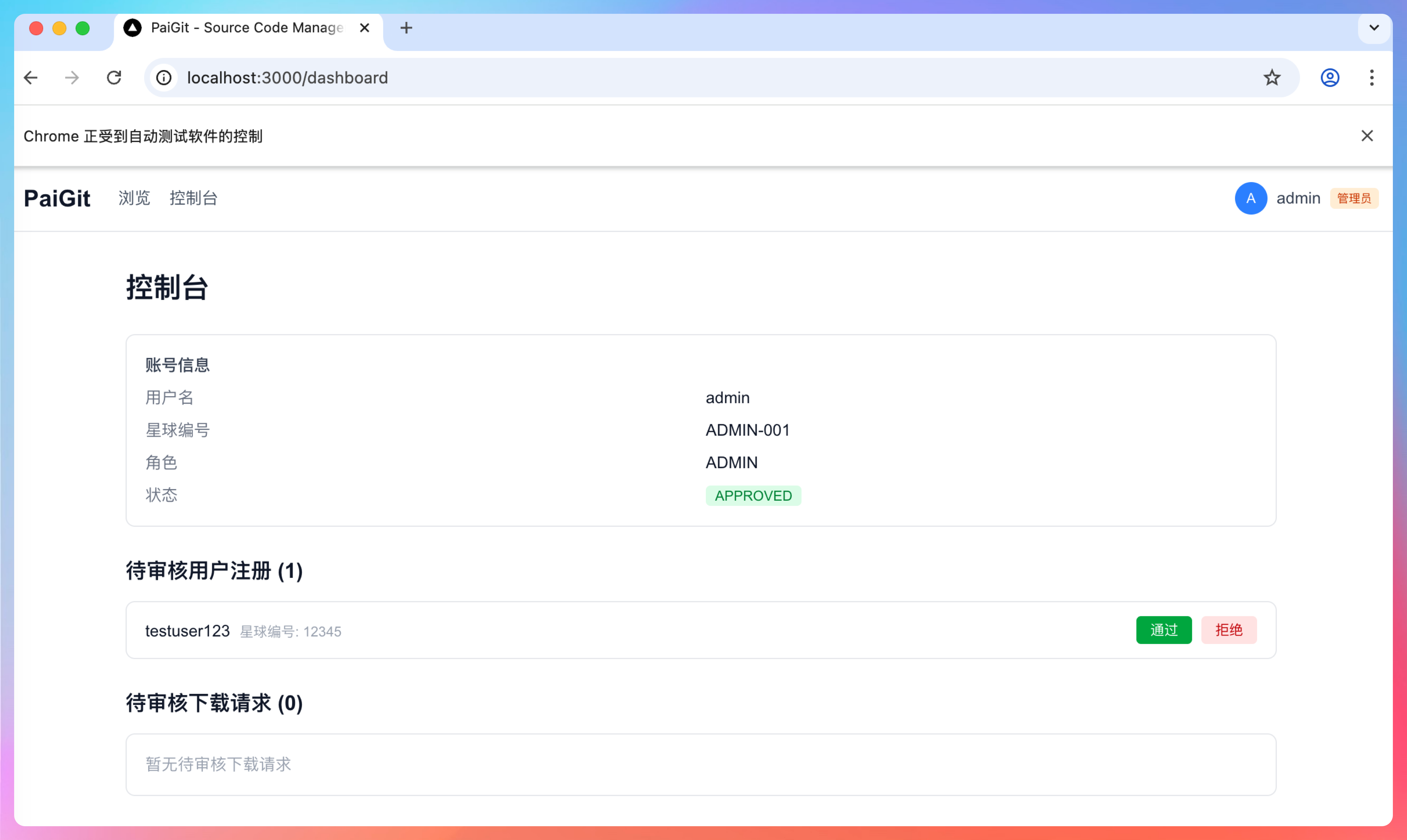 下载模块前端完善 — 正常工作。Dashboard 新增了「我的下载申请」区域,展示申请历史和状态标签(已通过/绿色)。管理员区域保留了「待审核下载请求」面板,支持审批通过/拒绝操作。仓库详情页的下载按钮根据状态正确显示。